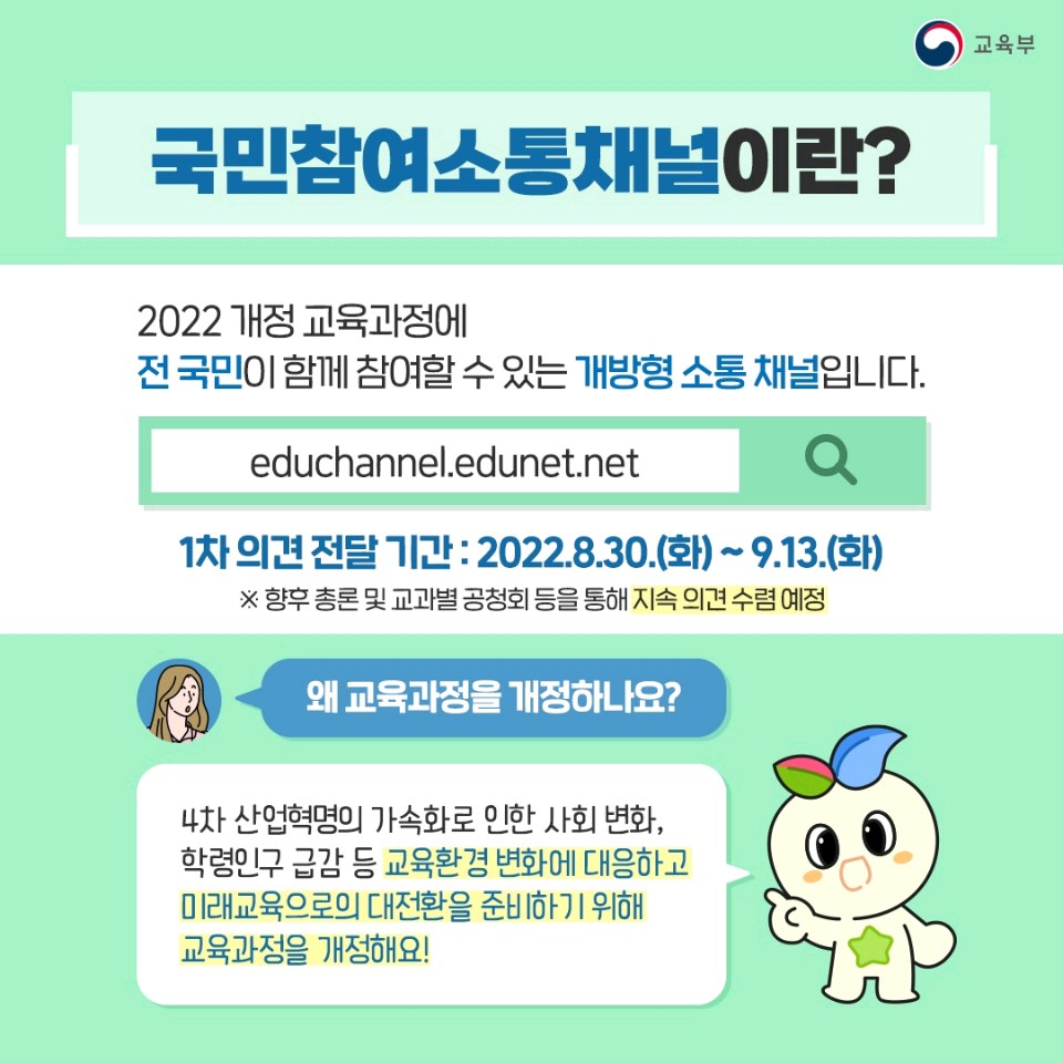 '2022년 개정 교육과정 개방형 소통 채널(educhannel.edunet.net)'에서 전국민 의견을 수렴하고 있습니다.