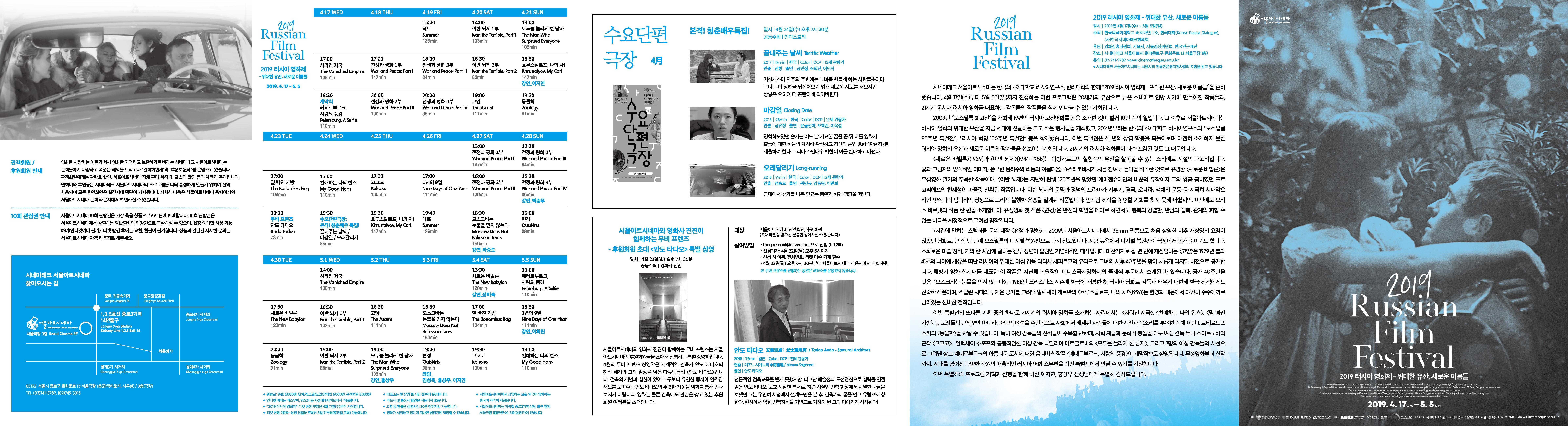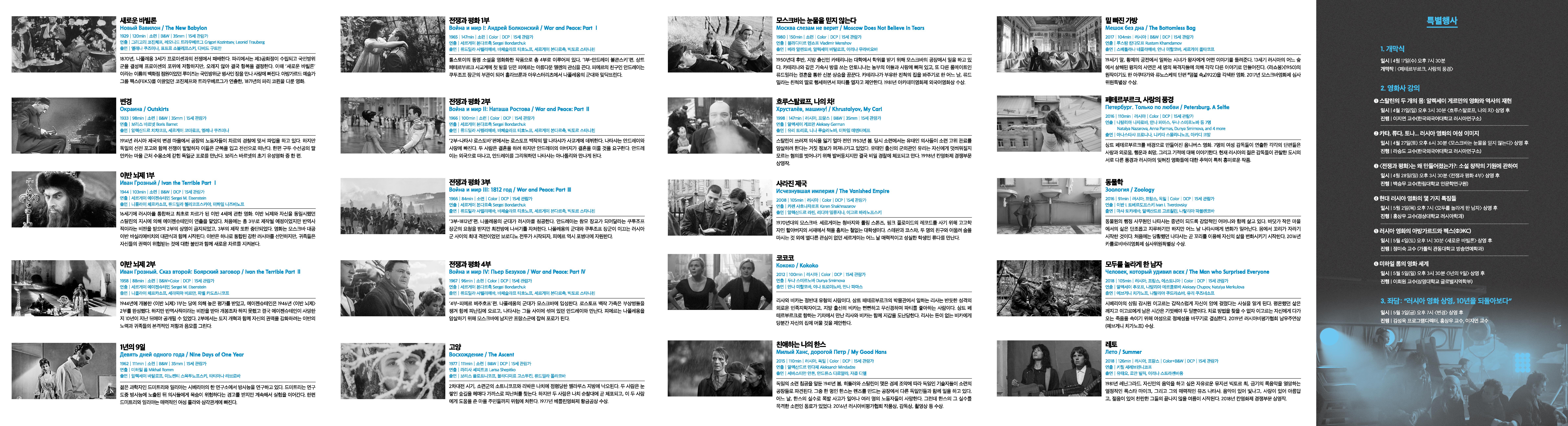 한국외국어대학교 러시아연구소는 한국시네마테크협의회, 한러대화와 함께 종로 3가에 위치한 서울아트시네마에서 2019 러시아영화제를 개최합니다. “위대한 유산, 새로운 이름들”이라는 제목의 이번 영화제에서는 세계 영화사에서 큰 의미를 갖는 영화임에도 불구하고 국내에 소개가 비교적 덜 되었던 러시아 고전 영화들과 함께 최근 러시아에서 주목 받은 신예감독들의 신작들이 소개됩니다. 또한 올해로 개봉 40주년을 맞이하는 ‘모스크바는 눈물을 믿지 않는다’와 유네스코 세계문화유산에 등재된 4부작 ‘전쟁과 평화’가 2018년 드디어 완성된 디지털 판본으로 상영될 예정입니다. 개막작인 ‘페테르부르크, 사랑의 풍경’은 페테르부르크를 배경으로 사랑이라는 주제 아래 7인의 여성 감독들이 만들어 낸 옴니버스 영화입니다. 소련이라는 무거운 이미지를 덜어 낸 섬세하고 감각적인 영화들을 통해 현대 러시아의 삶과 사회를 새롭게 이해할 수 있는 기회가 되길 바랍니다.