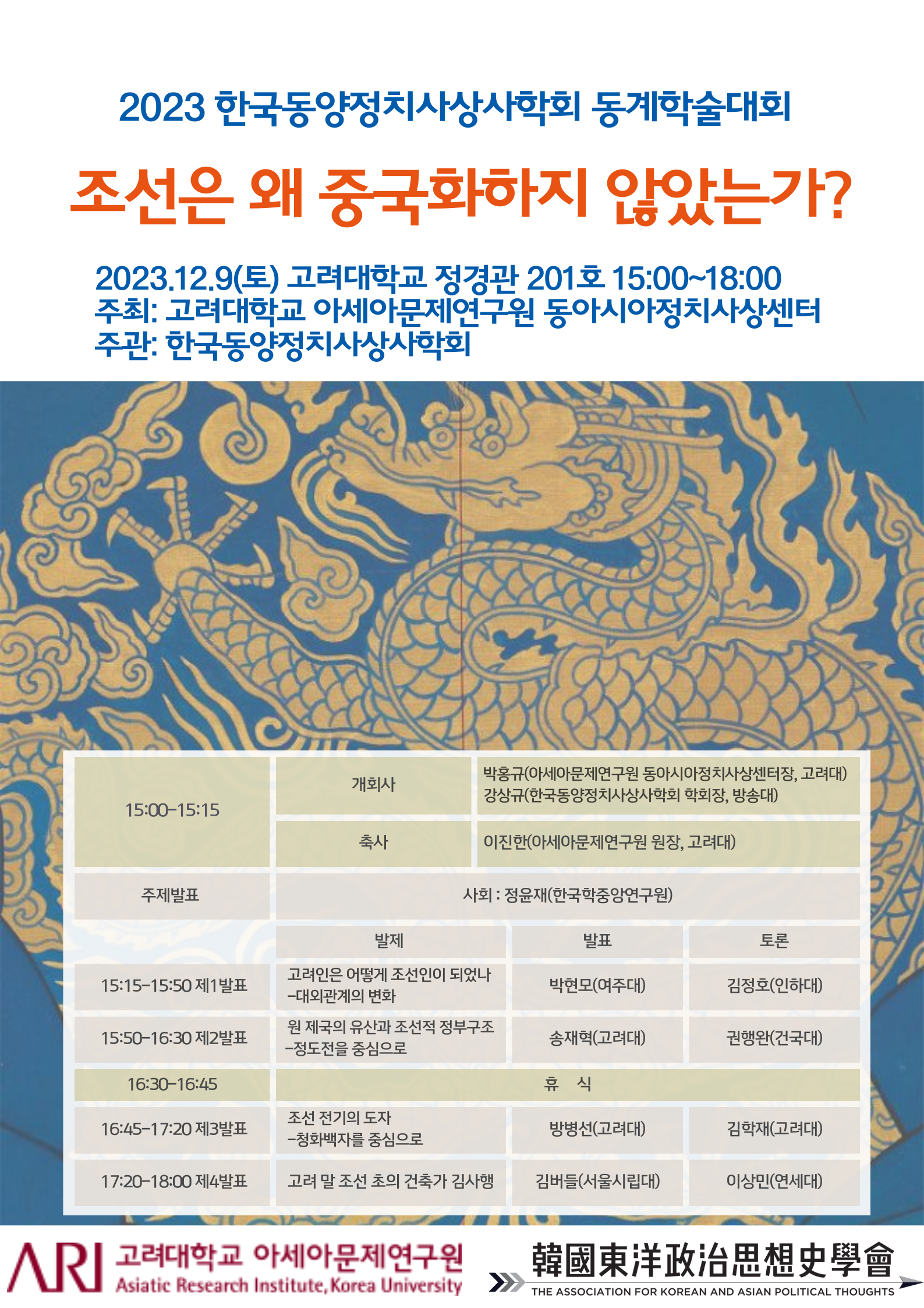 한국동양정치사상사학회에서 이번에 <조선은 왜 중국화하지 않았는가?>라는 주제로 성찰하고 토론하는 동계 학술대회를 개최하게 되었습니다. 이번 학술대회는 고려대학교 아세아문제연구원 동아시아 정치사상센터가 주축이 되어 준비합니다.