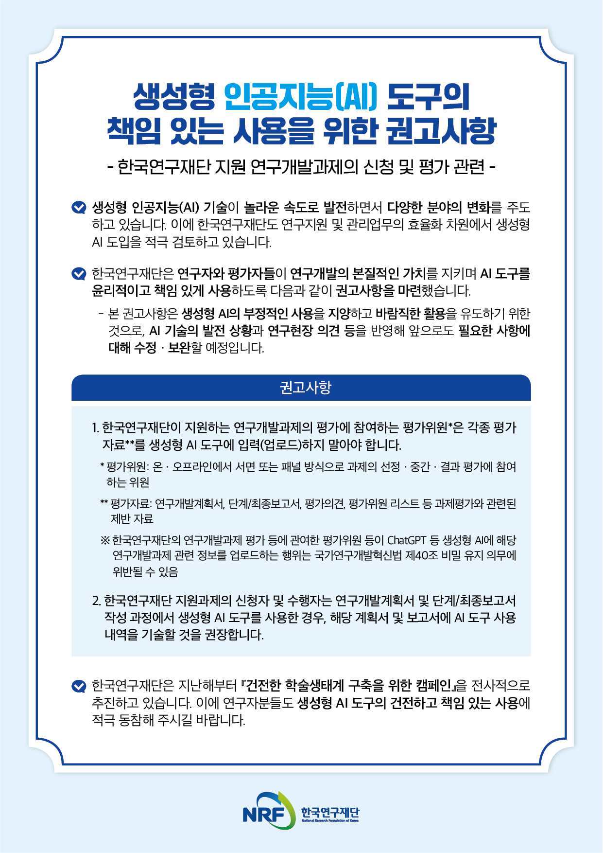 모든 연구자들이 AI도구를 윤리적이고 책임 있게 사용할 수 있도록 [한국연구재단]에서 보내온 권고사항입니다.
