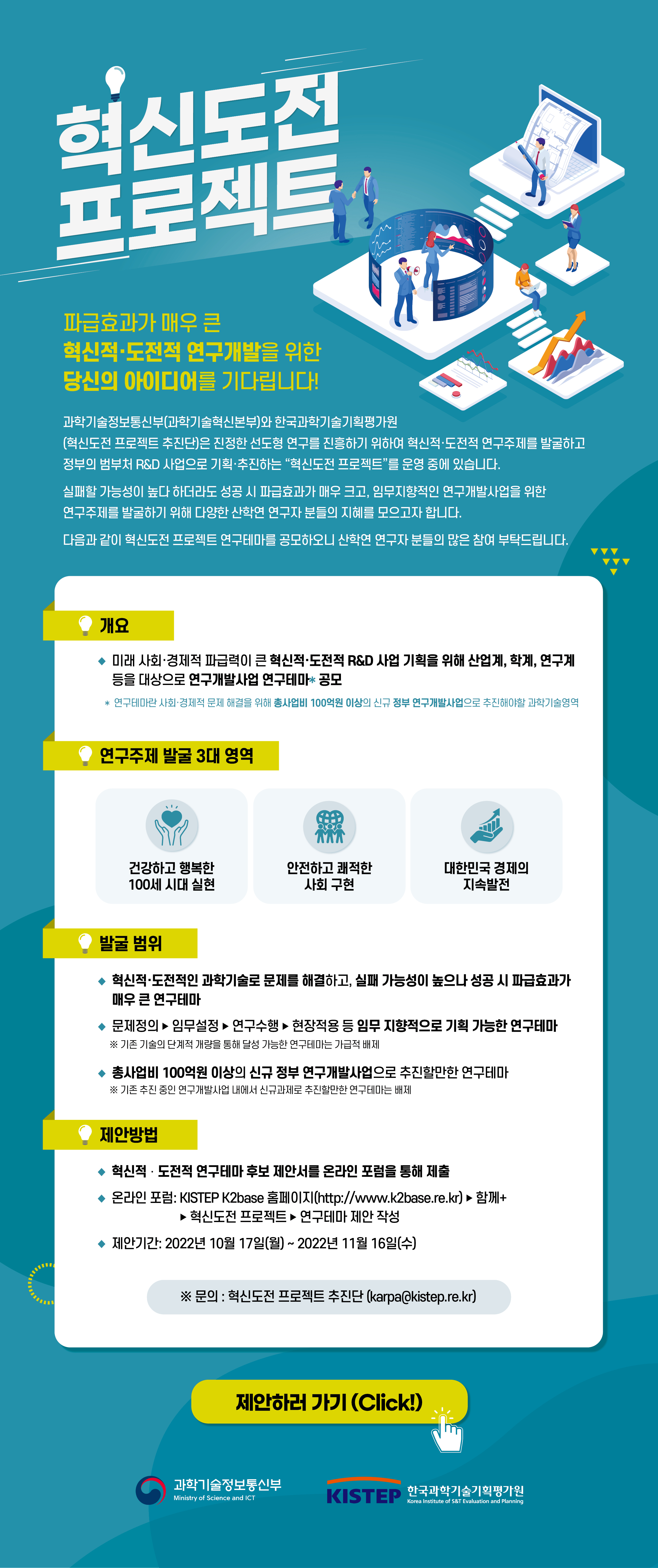 [한국과학기술기획평가원] 2022년 하반기 혁신도전 프로젝트 연구개발사업 발굴 협조 요청 안내