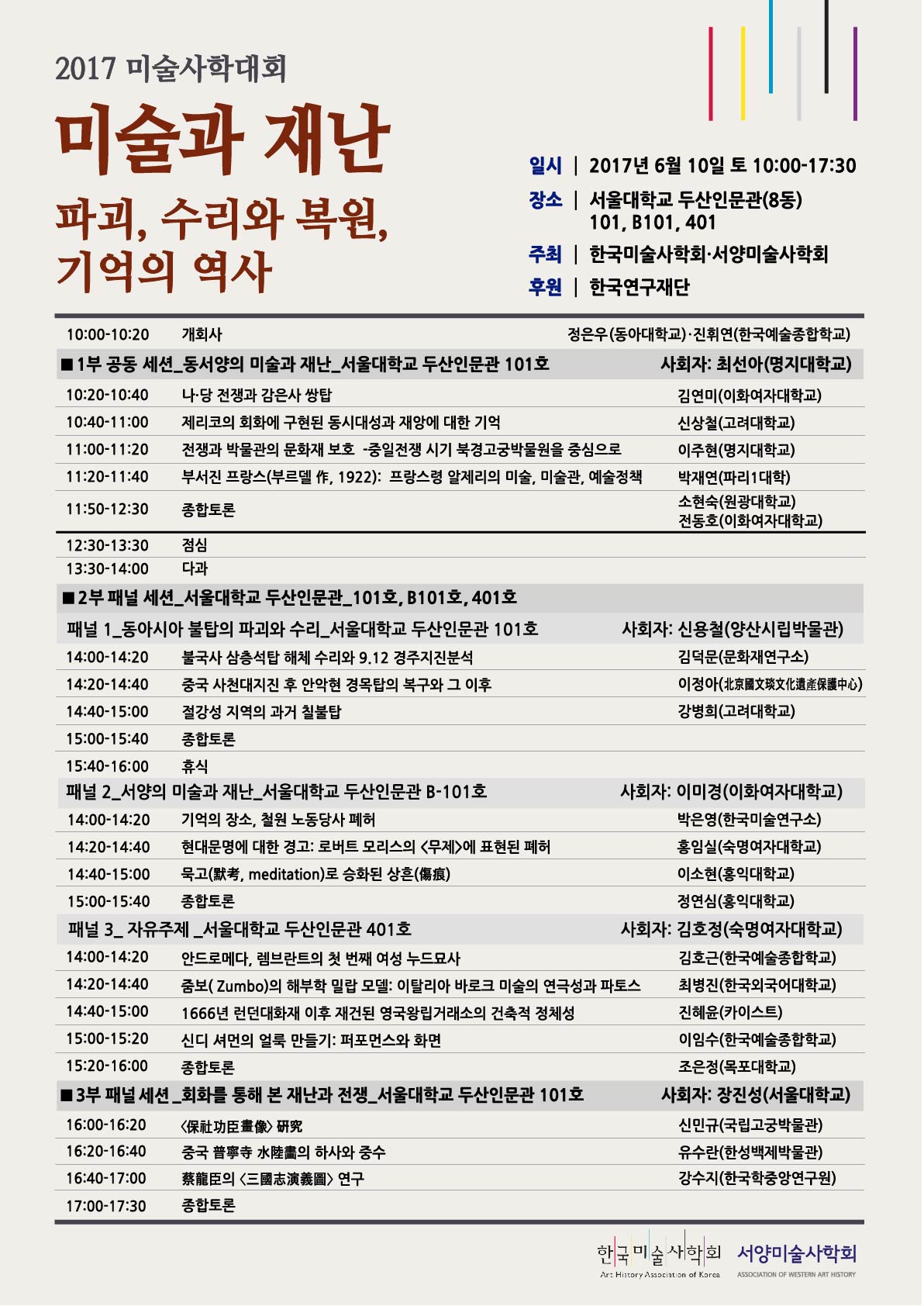 2017년 미술사학대회 및 서양미술사학회 춘계 학술대회가 6월 10일(토) 서울대학교에서 개최됩니다. 회원 여러분의 많은 관심과 참여 바랍니다.