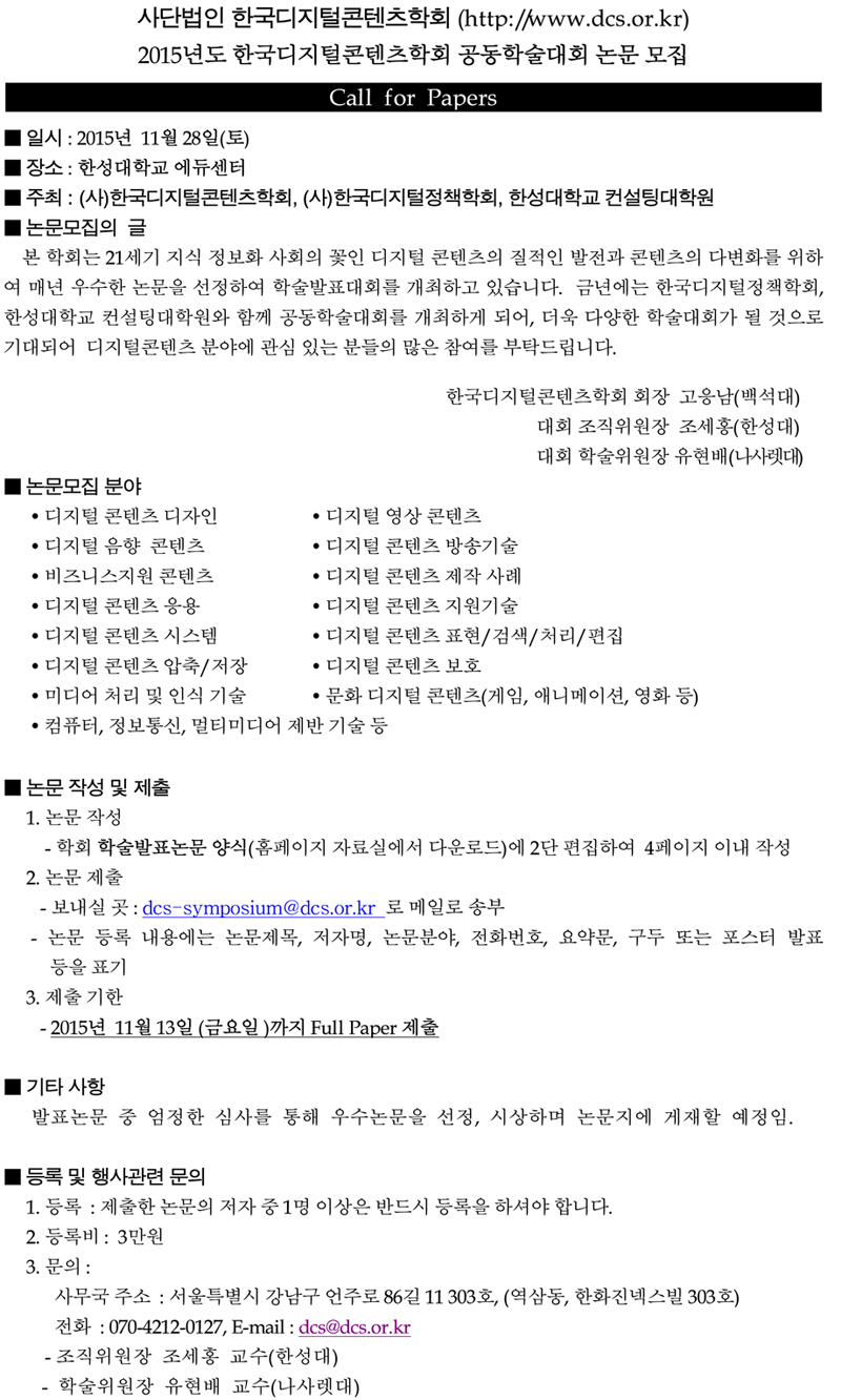 제16회 한국디지털콘텐츠학회 공동학술대회 논문모집 ■ 일시 : 2015년 11월 28일(토) ■ 장소 : 한성대학교 에듀센터 ■ 주최 : (사)한국디지털콘텐츠학회, (사)한국디지털정책학회, 한성대학교 컨설팅대학원 ■ 논문모집의 글 본 학회는 21세기 지식 정보화 사회의 꽃인 디지털 콘텐츠의 질적인 발전과 콘텐츠의 다변화를 위하여 매년 우수한 논문을 선정하여 학술발표대회를 개최하고 있습니다. 금년에는 한국디지털정책학회, 한성대학교 컨설팅대학원와 함께 공동학술대회를 개최하게 되어, 더욱 다양한 학술대회가 될 것으로 기대되어 디지털콘텐츠 분야에 관심 있는 분들의 많은 참여를 부탁드립니다. 한국디지털콘텐츠학회 회장 고응남(백석대) 대회 조직위원장 조세홍(한성대) 대회 학술위원장 유현배(나사렛대) 주 요 일 정 논문 원고마감 --------------------------------------2015년 11월 13일(금) 학술대회 일정 --------------------------------------2015년 11월 28일(토) 논문 발표분야 디지털융합정책, 스마트정책, 빅데이터 분야 : 스마트정부, 스마트경영, 스마트기술,디지털융합정책, 스마트 관련 정책, 디지털기술과 빅데이터, 정보화와 기업경쟁력, 빅데이터 및 융합신산업 우수사례, 빅데이터와 IoT산업 육성정책, 차세대 지식서비스 신산업 전략, 지식서비스 및 컨설팅산업의 선진화 전략, 1인 지식기업과 기업의 국제경쟁력 방안 등 스마트융합, 지식서비스&컨설팅 분야 : 컨설팅 방법론, 컨설팅 Toolkit 개발, 컨설팅 사례연구, 자영업 컨설팅, 소상공인 컨설팅, 쿠폰제 컨설팅, 이노비즈기업 컨설팅, 벤처기업 컨설팅, 수출기업 컨설팅, FTA 컨설팅, 경영컨설팅, 기술컨설팅, 구조조정 컨설팅CSR 컨설팅, 디자인 컨설팅, 컨버전스 컨설팅, 협업 컨설팅, 그린 컨설팅, 지식융합 및 지식서비스 논문 작성 및 제출 유의사항 첨부한 'TemplateFile' 다운로드 받아 논문 작성 후 메일(dcs-symposium@dcs.or.kr)로 접수. 구두발표 : 구두 발표자는 정해진 발표자료(PPT)파일 준비 ★ 석사과정 대학원, 일반 대학생(학부생) 각각 학술대회 세션, 시상 별도로 구성 ★ 논문양식은 홈페이지 '자료실-주요양식' 에서도 다운받으실 수 있습니다. - 양식다운받기 >> http://dcs.or.kr/bbs/board.php?bo_table=download&wr_id=14 * 근번 2015년 한국디지털콘텐츠학회 국내학술대회에 제출하신 논문은 국제학술대회(ICDC2015)와 연계하여 Scopus 국제저널에 적극 추천하여 게재예정이니 많은 논문 제출 부탁드립니다. (단, 한글논문은 아래 주소참조하여 영문 버전으로 재작성하여 제출바랍니다. 국제학술대회 홈페이지 : http://icatse.org/icisa 논문양식 다운로드 : http://www.springer.com/computer/lncs?SGWID=0-164-6-793341-0) Scopus저널 논문 제출 마감일: 11월 30일, 게재료 별도