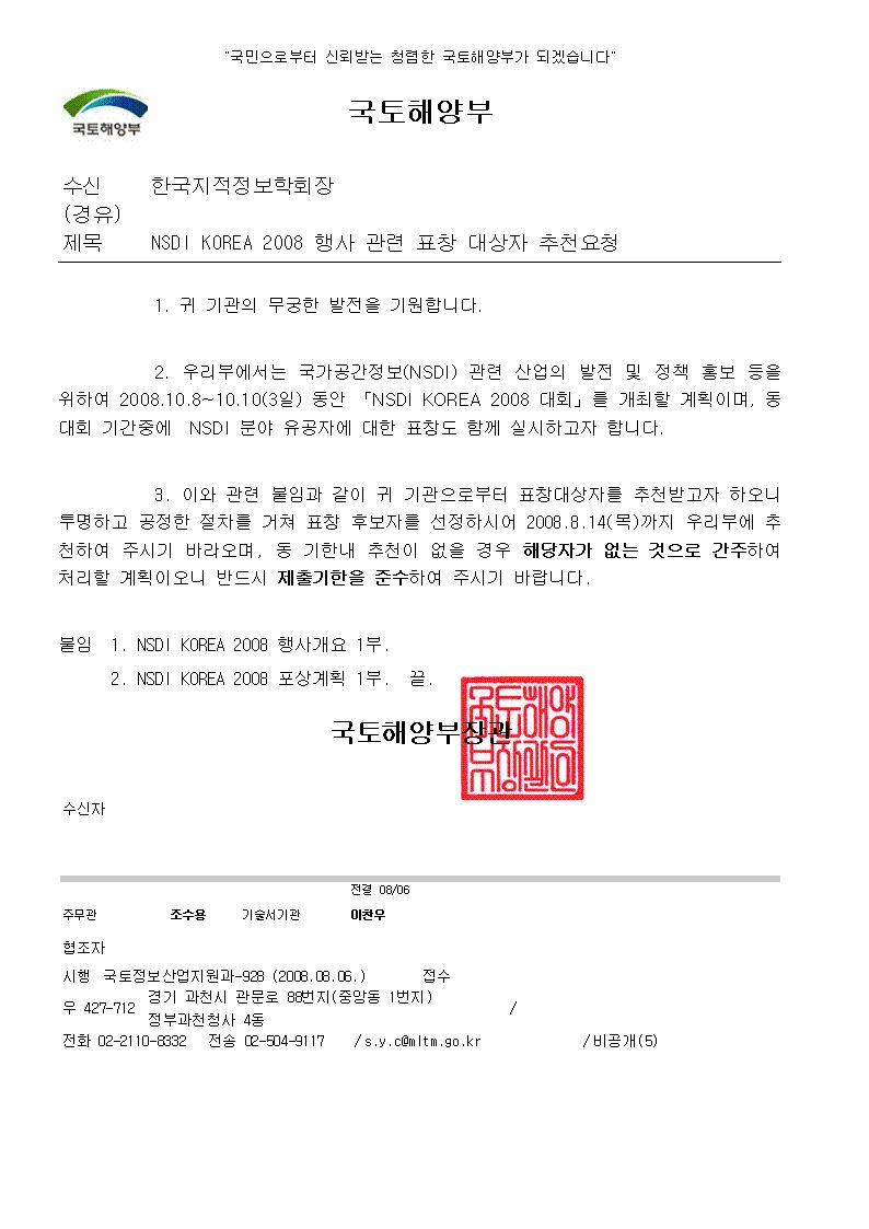 NSDI Korea 2008 포상 추천(국토해양부)