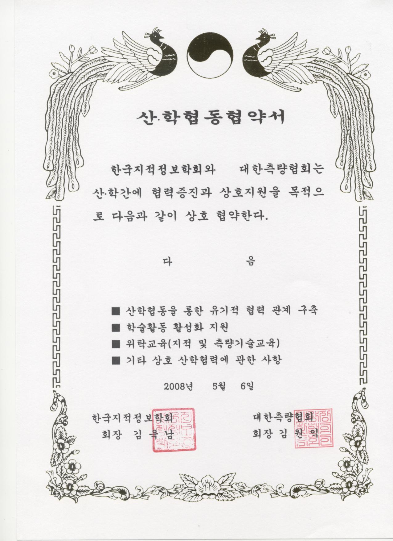 2008년 5월 6일 한국지적정보학회(회장 김욱남)와 대한측량협회(회장 김원익)간에 산학협력협정을 체결하였습니다.