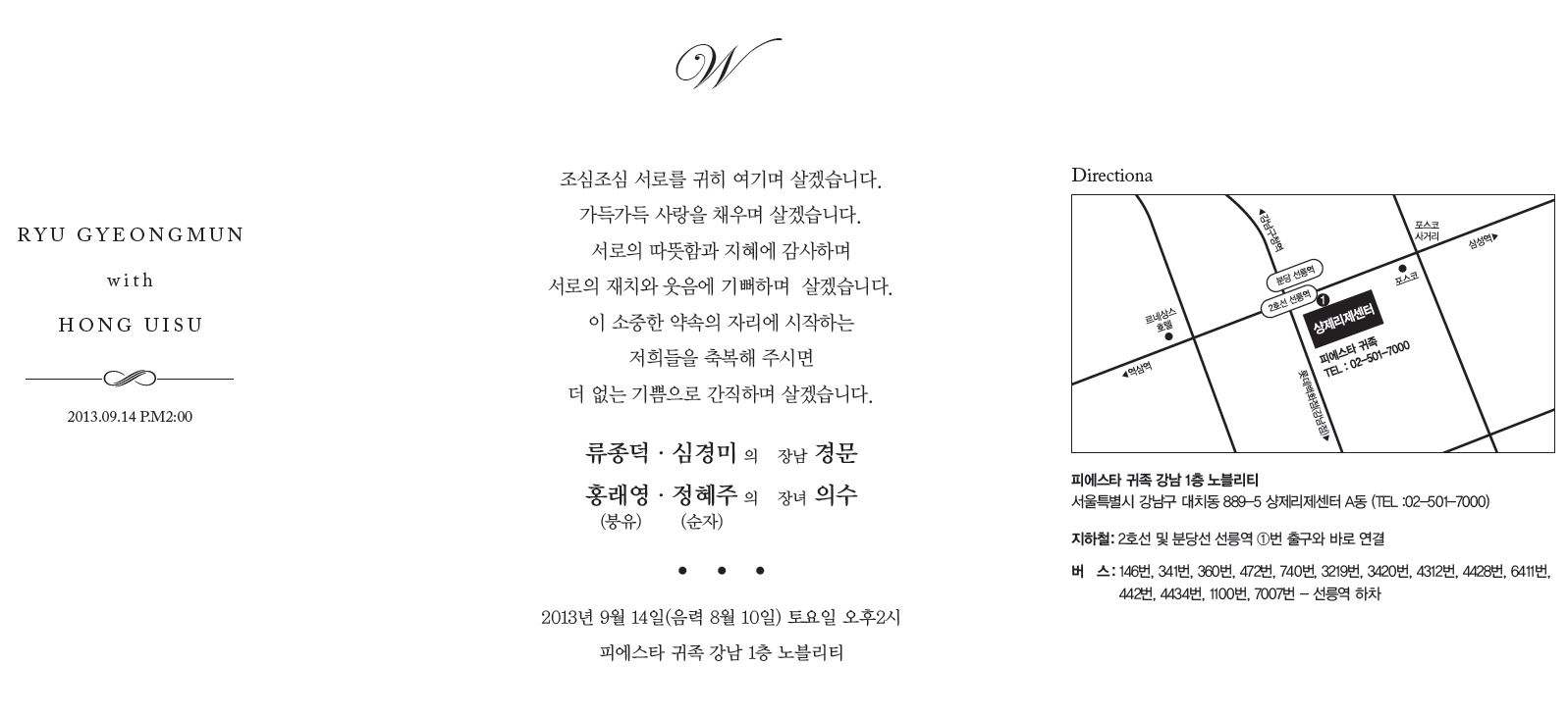 축하합니다 ^ㅡ^*한국지반공학회 홍의수 대리 결혼식이 아래와 같이 있으니 회원여러분들의 많은 축복 바랍니다.♡ 일 시 : 2013년 9월 14일 토요일 오후2시♡ 장 소 : 피에스타 귀족 강남 1층 노블리티♡ 연락처 : 010-9242-8284 홍의수