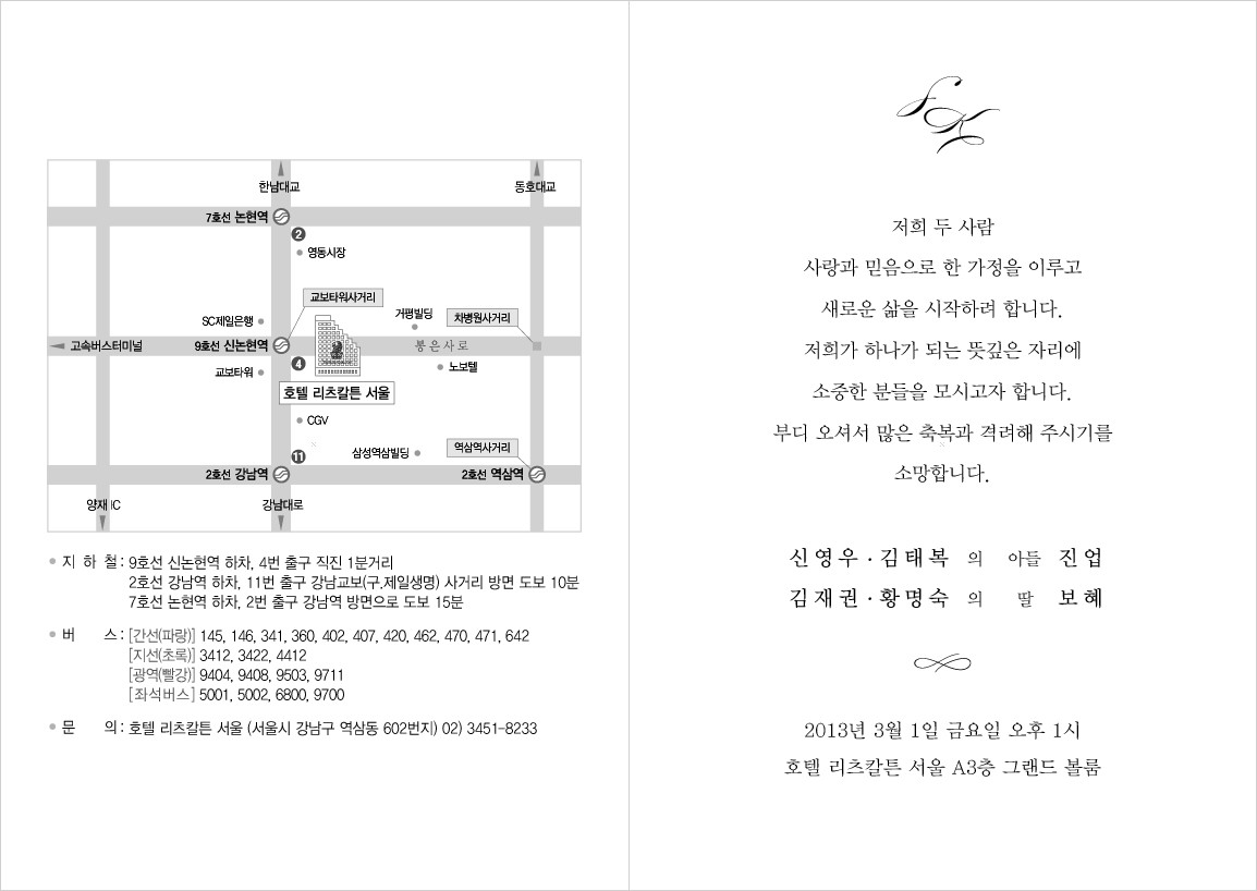 축하합니다 ^ㅡ^*우리학회 이사이신 경기철도주식회사 김재권 대표이사의 자녀 혼사가 아래와 같이 있사오니 회원여러분들의 많은 축복 바랍니다.♡ 일 시 : 2013년 3월 1일 (금) 오후 1시♡ 장 소 : 호텔 리츠칼튼 서울 A3층 그랜드 볼룸♡ 연락처 : 김재권 010-5496-0092