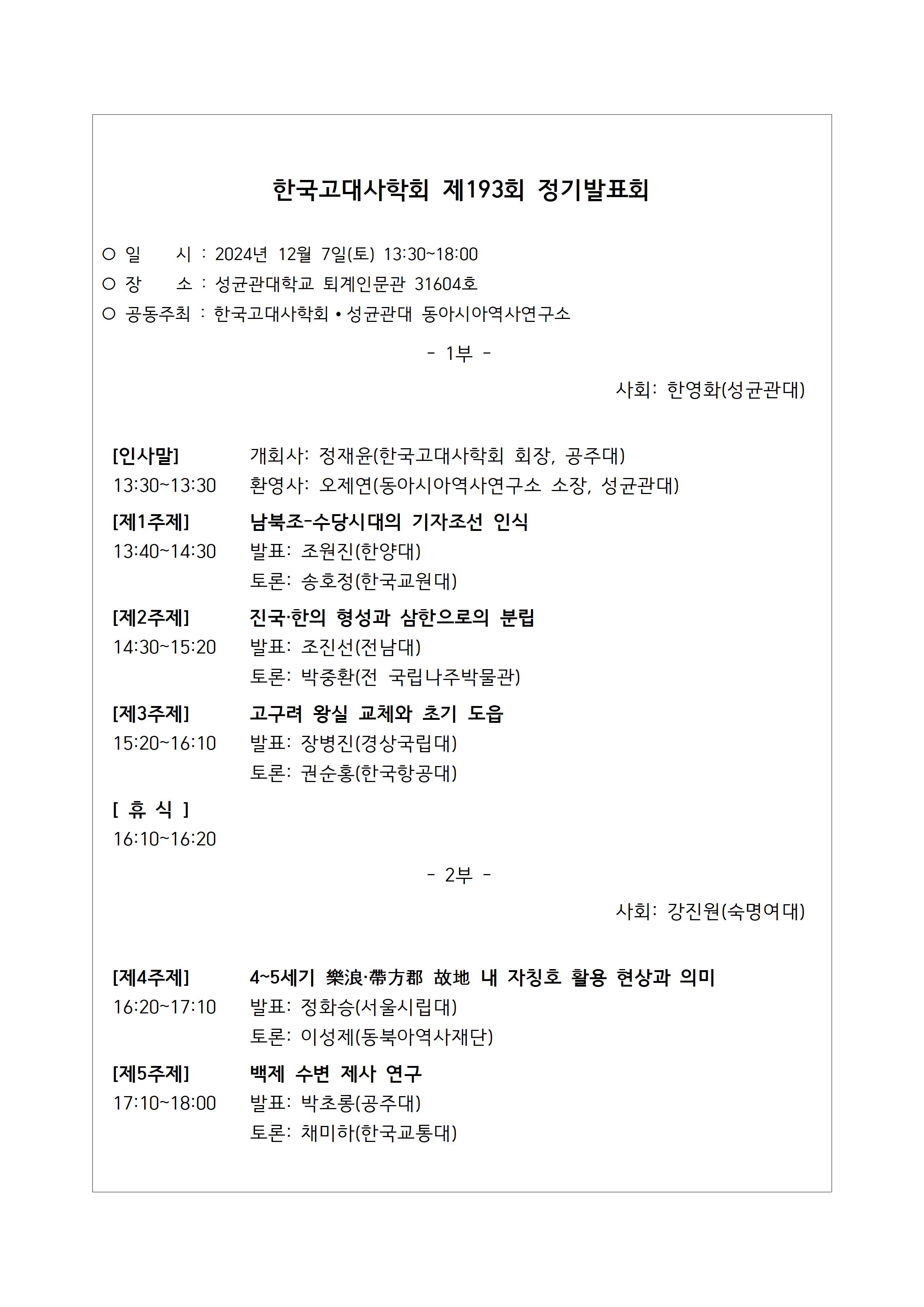 [공지] 한국고대사학회 제193회 정기발표회 안내