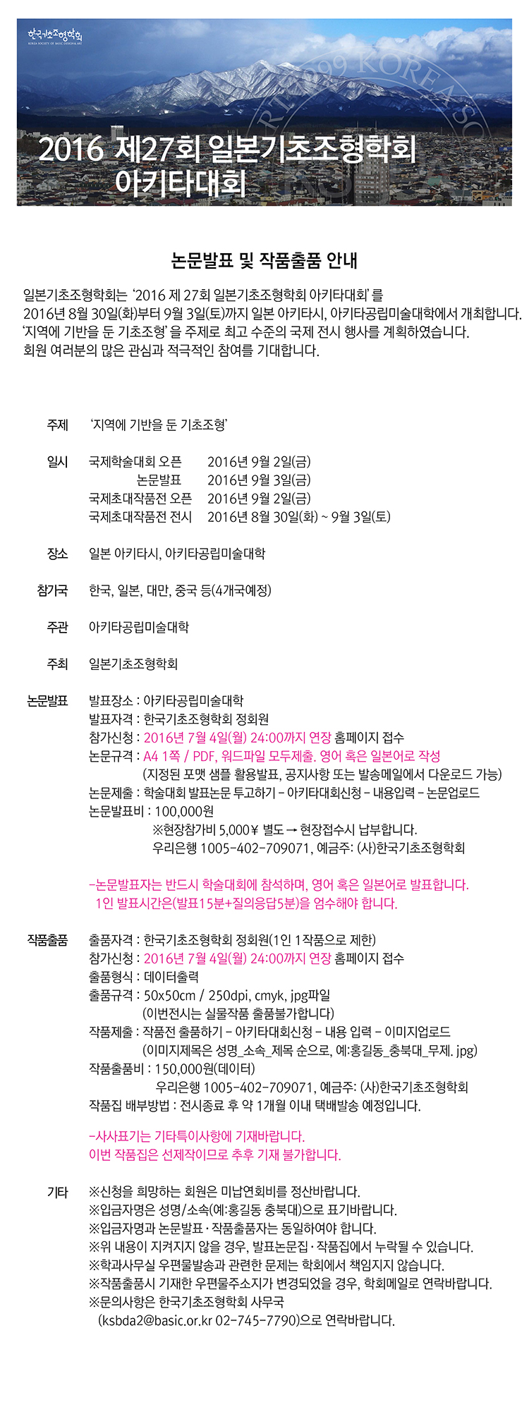 2016 제27회 일본기초조형학회 아키타대회 접수마감 연장 안내