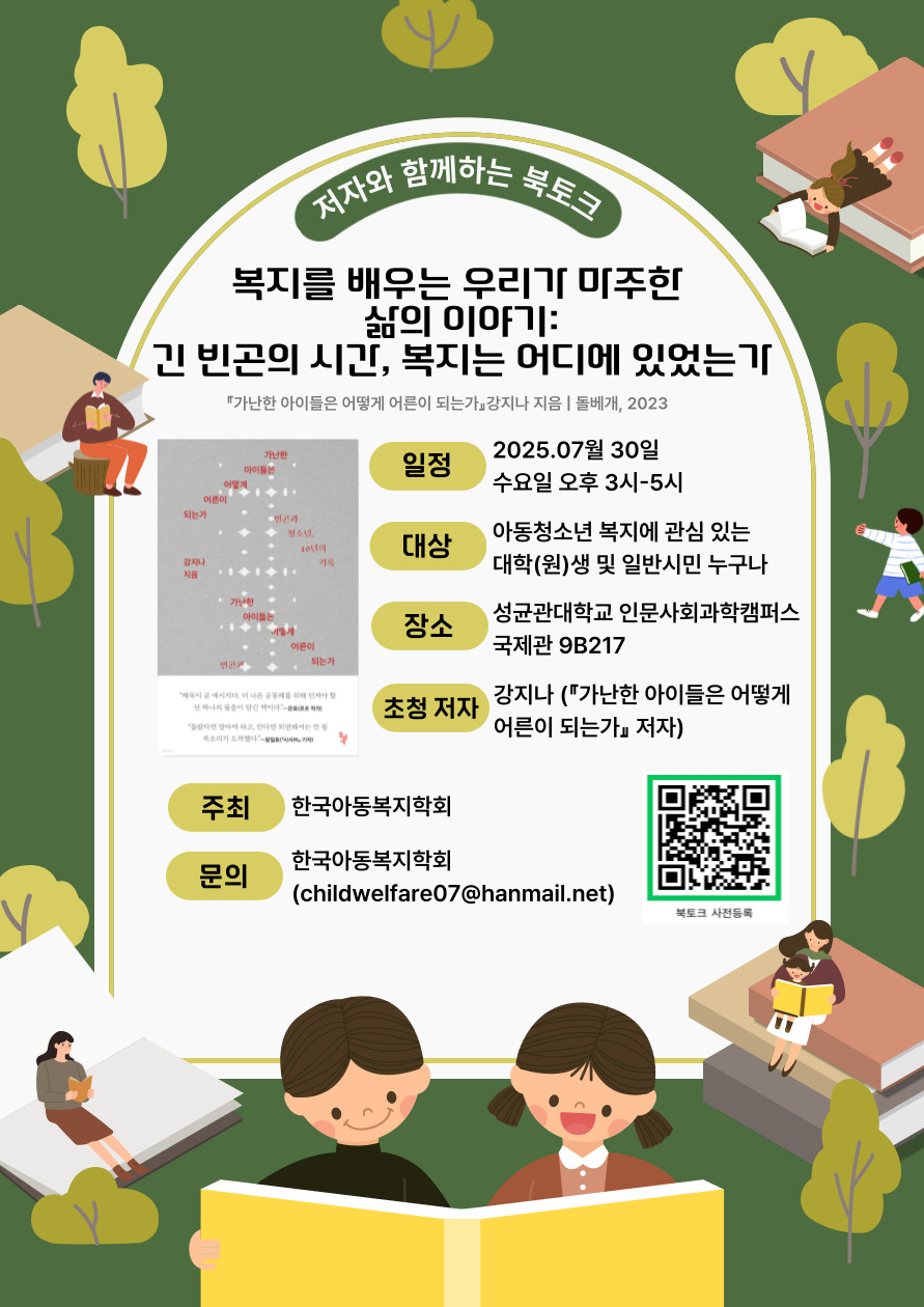 『가난한 아이들은 어떻게 어른이 되는가』는 한 교사가 10여 년 동안 만난 8명의 청소년들의 삶을 기록한 책입니다. 한국아동복지학회는 저자 강지나 선생님을 모시고, 단순한 ‘경제적 결핍’을 넘어 돌봄의 부재, 관계의 단절, 그리고 제도의 간헐적 개입 속에서 빈곤의 시간이 어떻게 이어졌는지를 함께 되짚어보고자 합니다.