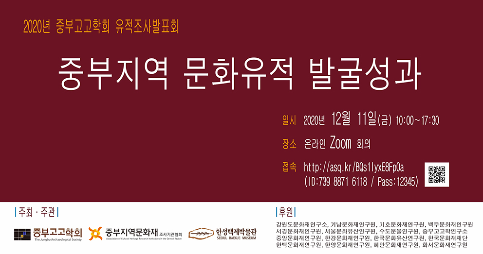 COVID-19로 인하여 2020년 중부고고학회 유적조사발표회는 비대면 온라인회의(ZOOM)으로 진행합니다.