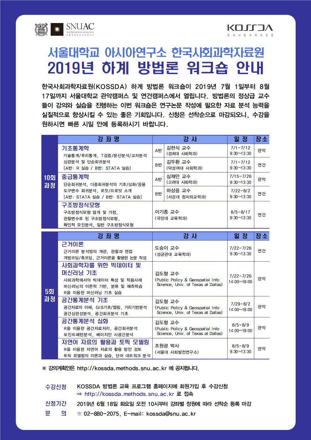 한국사회과학자료원(KOSSDA)의 하계 방법론 워크숍이 2019년 7월 1일부터 8월 17일까지 서울대학교 관악캠퍼스 및 연건캠퍼스에서 열립니다. 방법론의 정상급 교수들이 강의와 실습을 진행하는 이번 워크숍은 연구논문 작성에 필요한 자료 분석 능력을 실질적으로 향상시킬 수 있는 좋은 기회입니다. 신청은 선착순으로 마감되오니, 수강을 원하시면 빠른 시일 안에 등록하시기 바랍니다.