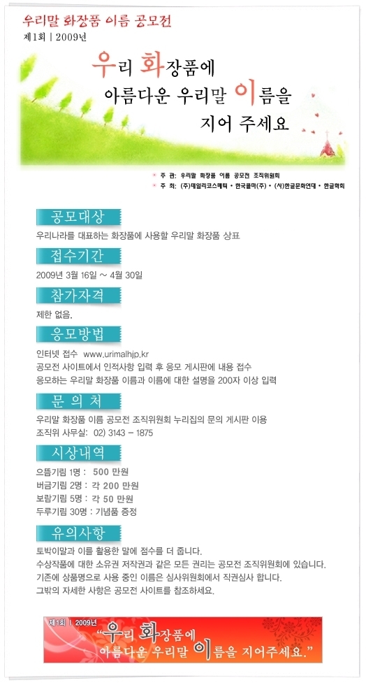 우리가 흔히 쓰는 화장품은 그 종류가 수없이 많지만 그에 따른 이름은 모두 외래어나 외국어 투성이에, 뜻을 알 수 없는 말들로 가득합니다. 그래서 위 네 기관(단체, 회사)이 뜻을 모아 '우리말 화장품 이름 공모전 조직위원회'를 결성하여 우수한 우리 화장품에 한국적이고 아름다운 우리말을 지어 보급하고, 화장품을 사용하는 모든 사람들에게 우리말 화장품 이름에 대한 새로운 인식을 갖게 하고자 합니다.