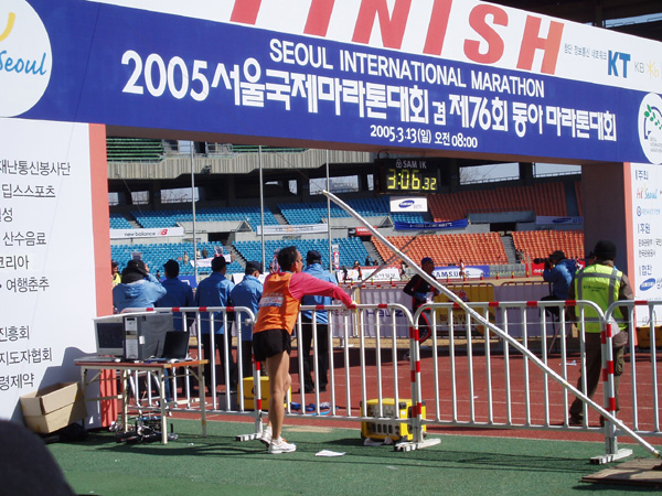 2005년 3월 13일 (일) 아침, '2005서울국제마라톤대회 겸 제76회동아마라톤대회에서 등에 '한글날을 국경일로' 등판 딱지를 붙이고 출발지인 세종로에서 결승점인 잠실종합운동장까지 42.195㎞를 완주한 참가 선수들의 모습. 이 날 한글날국경일제정범국민추진위원회가 주최하고 한글학회, 세종대왕기념사업회, 외솔회, 한글인터넷주소총연합회가 후원하여 이 마라톤 대회에서 한글날 국경일 제정 추진을 위한 홍보 운동을 하였다. 새벽부터 한글 학회 직원들과 관련 단체 회원들, 김제에서 마라톤 대회에 참가하기 위해 올라 온 정 갑주 할아버지 외 20여 명 등 한글 사랑을 실천하는 이들은, 출발지인 세종로 세종문화회관 앞에서 마라톤 대회에 참가한 선수들의 등에 '한글날을 국경일로!'(가로 27.5×8.5㎝)라고 세긴 등판 딱지(스티커) 5,000장을 붙여 주거나 나누어 주었다. (찍은 이: 꿈돌이, 20050313.)
