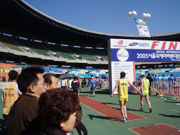 2005년 3월 13일 (일) 아침, '2005서울국제마라톤대회 겸 제76회동아마라톤대회에서 등에 '한글날을 국경일로' 등판 딱지를 붙이고 출발지인 세종로에서 결승점인 잠실종합운동장까지 42.195㎞를 완주한 참가 선수들의 모습. 이 날 한글날국경일제정범국민추진위원회가 주최하고 한글학회, 세종대왕기념사업회, 외솔회, 한글인터넷주소총연합회가 후원하여 이 마라톤 대회에서 한글날 국경일 제정 추진을 위한 홍보 운동을 하였다. 새벽부터 한글 학회 직원들과 관련 단체 회원들, 김제에서 마라톤 대회에 참가하기 위해 올라 온 정 갑주 할아버지 외 20여 명 등 한글 사랑을 실천하는 이들은, 출발지인 세종로 세종문화회관 앞에서 마라톤 대회에 참가한 선수들의 등에 '한글날을 국경일로!'(가로 27.5×8.5㎝)라고 세긴 등판 딱지(스티커) 5,000장을 붙여 주거나 나누어 주었다. (찍은 이: 꿈돌이, 20050313.)