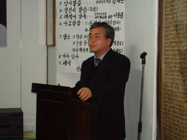 2005년 3월 7일 (월) 오후 5시에 한글 회관 강당에서 있은 공병우 박사 10주기 추모식에서 사회를 맡은 한글 학회 유 운상 사무국장님의 모습입니다. (찍은 이: 꿈돌이, 20050307.)