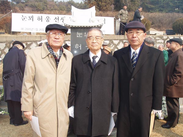 2005년 1월 26일 (수)에 모란공원 안 눈뫼 스승 무덤터(경기도 남양주시 화도읍 월산리)에 새로 세운 묘비 앞에 선 부산대 박 태권 명예교수, 한글 학회 김 계곤 회장, 경북대 김 종택 교수의 모습(왼쪽부터). (찍은 이: 꿈돌이, 20050126.)