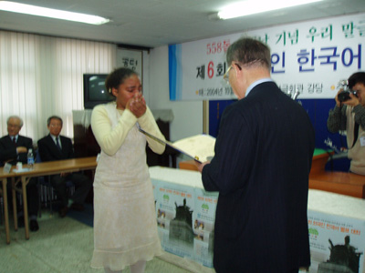 2004년 10월 24일 (일) 오전 10시부터 한글회관 강당에서 있은 '제6회 외국인 한국어 발표 대회'에서 으뜸기림을 차지한 카메룬의 크리스타 캄가 님이 상을 받으면서 기쁨의 눈물을 감추지 못하고 있다.