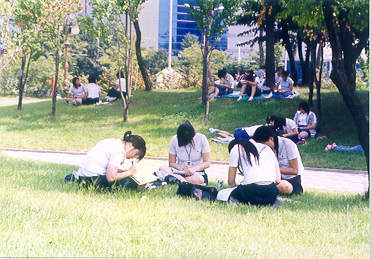 2004년 9월 4일, 여의도에서 있었던 제1회 한글이름 가진 이 글짓기 대회의 한 모습. 참가 학생들이 공원 잔디밭에 군데군데 모여서 글쓰기에 열중하고 있다.