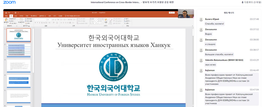 한국외대 러시아연구소 최우익  HK교수는 지난  11월  18(동북아 지역 국가간 협력 (Cross-Border Interactions in North and North-East Asia)을 주제로 개최된 온라인 국제학술대회에 참가하여  <한국 러시아학의 쟁점들과 한국외대 러시아연구소의 역할 러시아지역연구의 인문학적 전환과 극지연구의 전망 ( Актуальные задачи русистики в Корее и научной деятельности  IRS HUFS:  гуманитарно - общественное изучение РФ и перспективы исследований арктического региона )>이라는 주제로 발표하였다 .