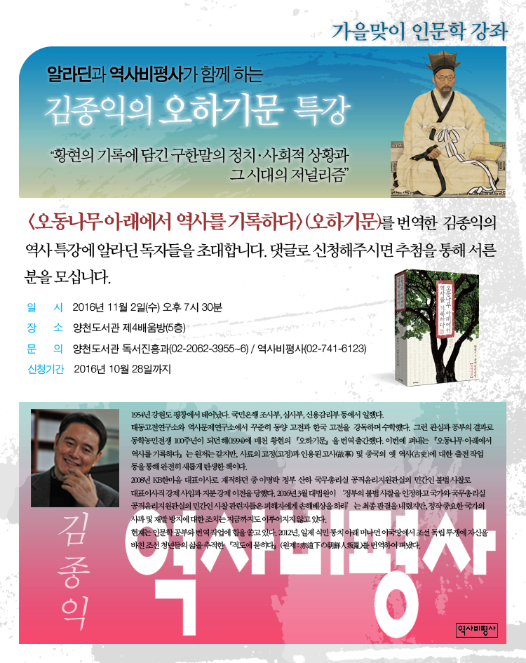 신간 <오동나무 아래에서 역사를 기록하다>(오하기문)의 역자 김종익 선생의 특강이 개최됩니다. 이미지 참조하시고 수강신청은 양천도서관이나 인테넷서점 알라딘에서 해주십시오. 많은 관심과참여 부탁드립니다.