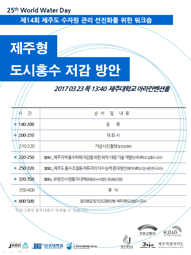 제14회 제주도 수자원 관리 선지화를 위한 워크숍이 제주대학교 아라컨벤션홀에서 아래와 같이 개최될 예정입니다.