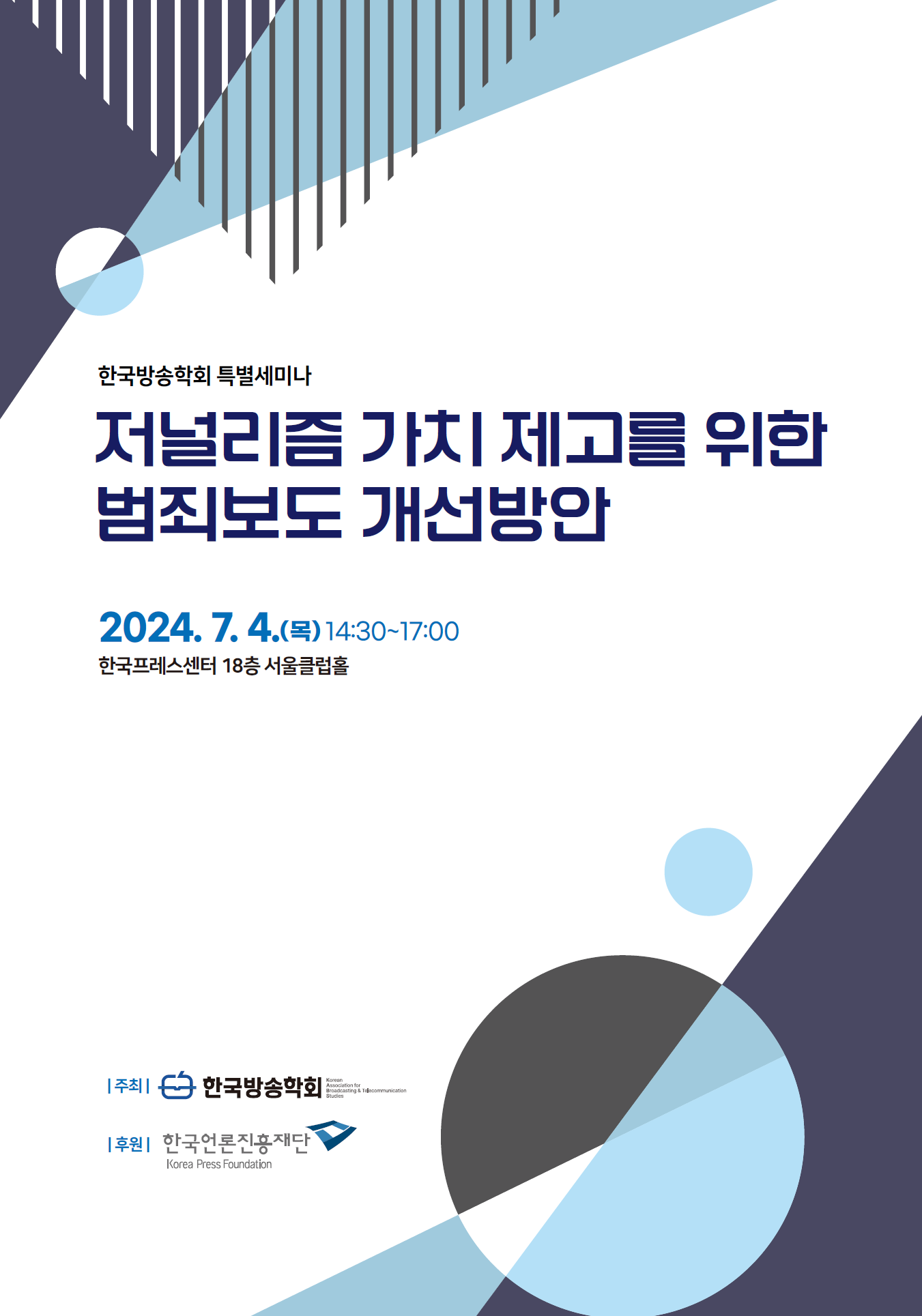 한국방송학회(학회장 전범수, 한양대 교수)는 오는 4() 1430분부터 한국프레스센터 18층 서울클럽홀에서 <저널리즘 가치 제고를 위한 범죄보도 개선방안>이라는 주제로 특별세미나를 개최한다.