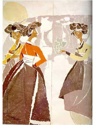 여인네들이 입고 있는 치마폭의 선 구성과 평면적인 색채로 인해 화면이 장식적으로 분할되는 효과를 낳고 있으며 대범한 인상을 준다. 이런 인상은 <이른 아침>처럼 직선적 구성을 사용한 1950년대 중반의 작품들로 이어지는 특성이기도 한다. 오른쪽에 술잔을 받쳐들고 있는 여인의 자세, 허리에 손을 얹고 당당한 자세로 오른편을 바라보는 여인, 그 뒤에 다소곳이 가려져 있는 여인 등 세 여인은 약간 변형만 된 채 반복된다.