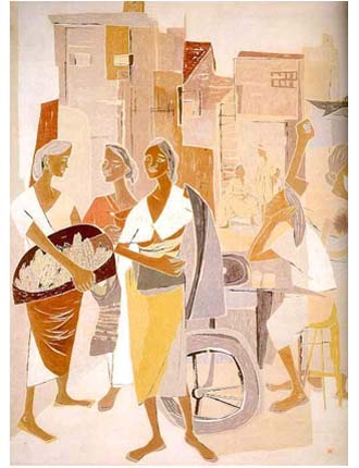 길을 나선 여인들의 모습이 경쾌한 필치로 형상화된 특이한 효과를 보여주었다. 거의 직선으로 배경의 건물과 여인의 자태가 상하로 길게 강조되어 클로즈업되고 있다. 특히 얼굴표현이 사진의 음화를 보는 것 같은 처리로 되어있는 등 다분히 서양적인 감각으로 처리되어 있다.