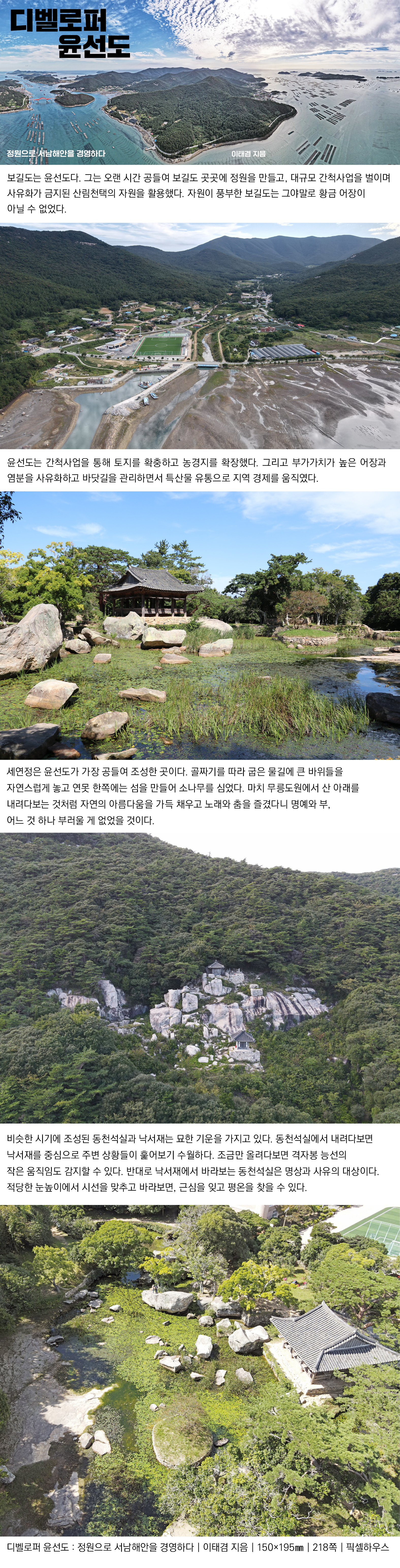 윤선도의 경영은 성공적이었다. 특히 공간에 대한 감각이 누구보다 뛰어났던 윤선도가 장소의 가치를 발견하고 연결하며 확장시키는 일련의 과정은 지금의 디벨로퍼가 제안하는 개발의 과정으로도 손색이 없어 보인다.