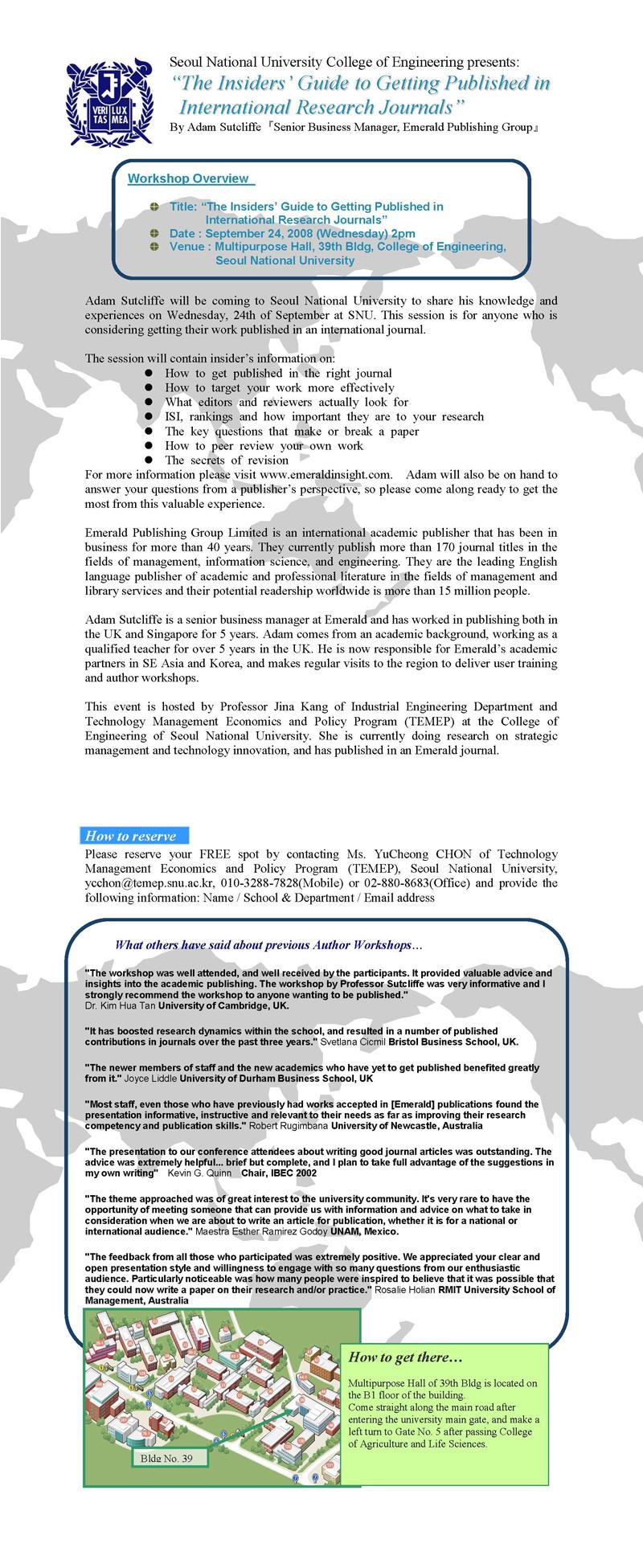 서울대학교에서 국제학술지 게재를 위한 논문작성법 세미나를 개최합니다.
