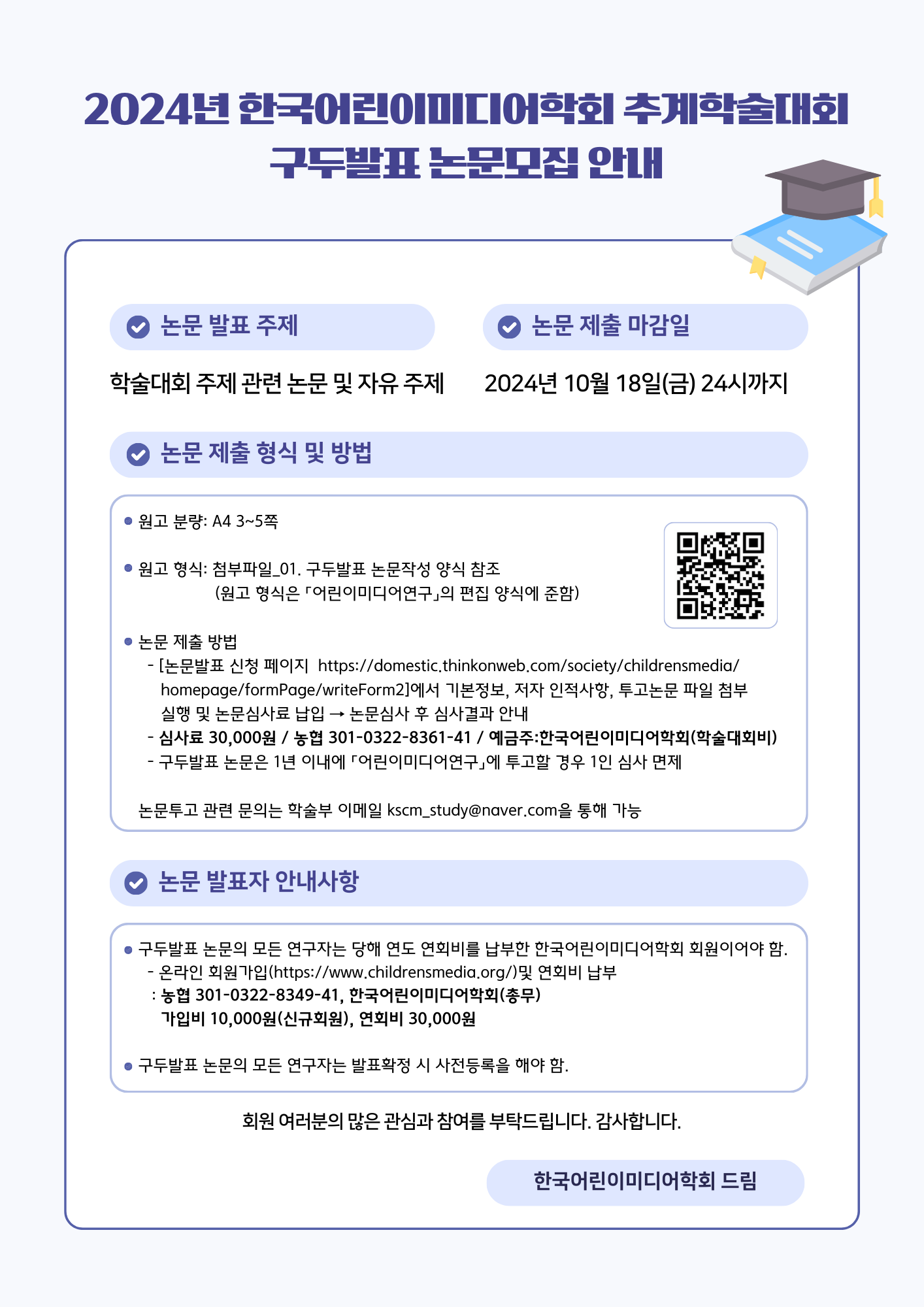 한국어린이미디어학회에 관심을 갖고 참여해주시는 회원님들께 깊이 감사드리며2024년 11월 16()에 개최되는 추계학술대회 구두발표 논문모집을 안내해 드립니다.