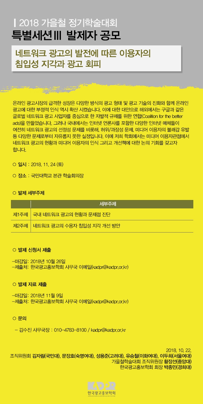 [KADPR] 2018 가을철학술대회 특별세션Ⅲ 발제자 공모 (네트워크 광고의 발전에 따른 이용자의 침입성 지각과 광고회피)
