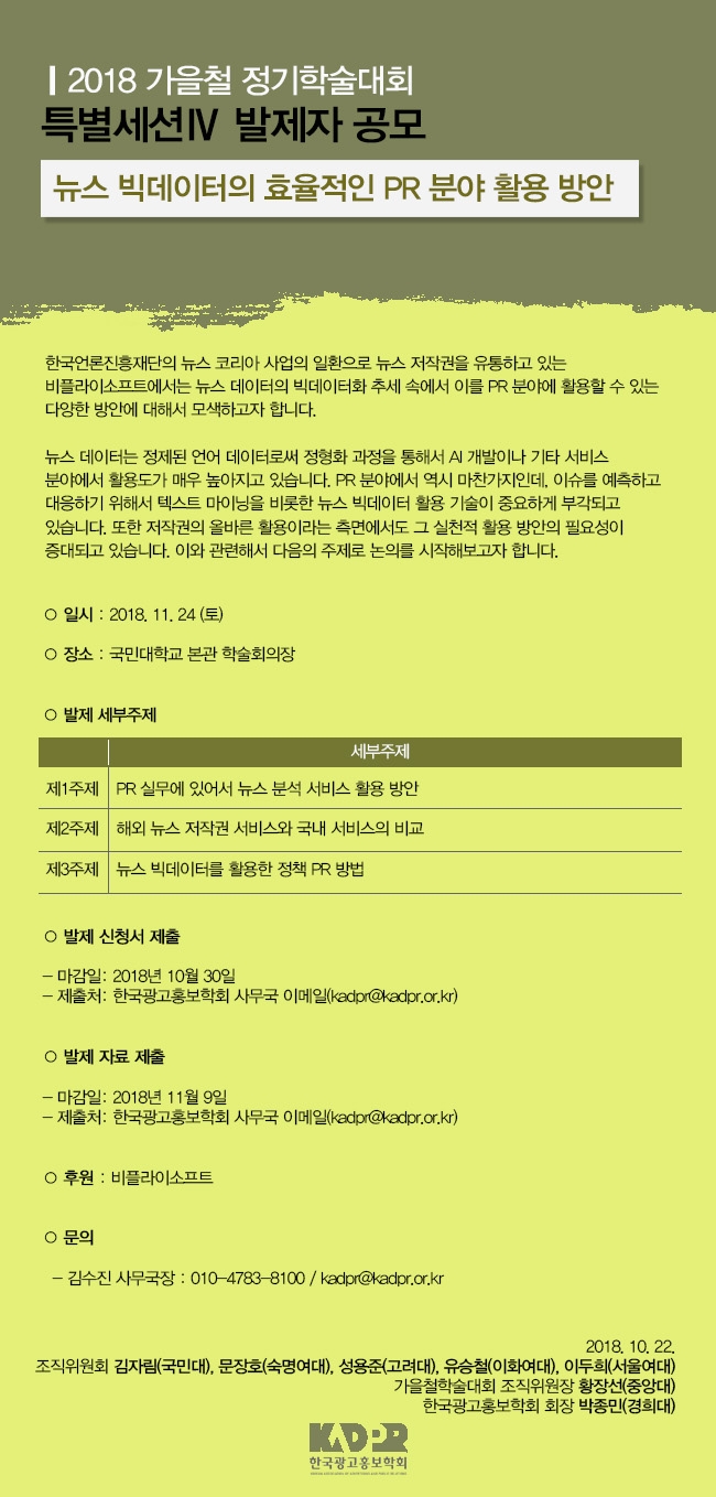 [KADPR] 2018 가을철학술대회 특별세션Ⅳ 발제자 공모 (뉴스 빅데이터의 효율적인 PR 분야 활용 방안)