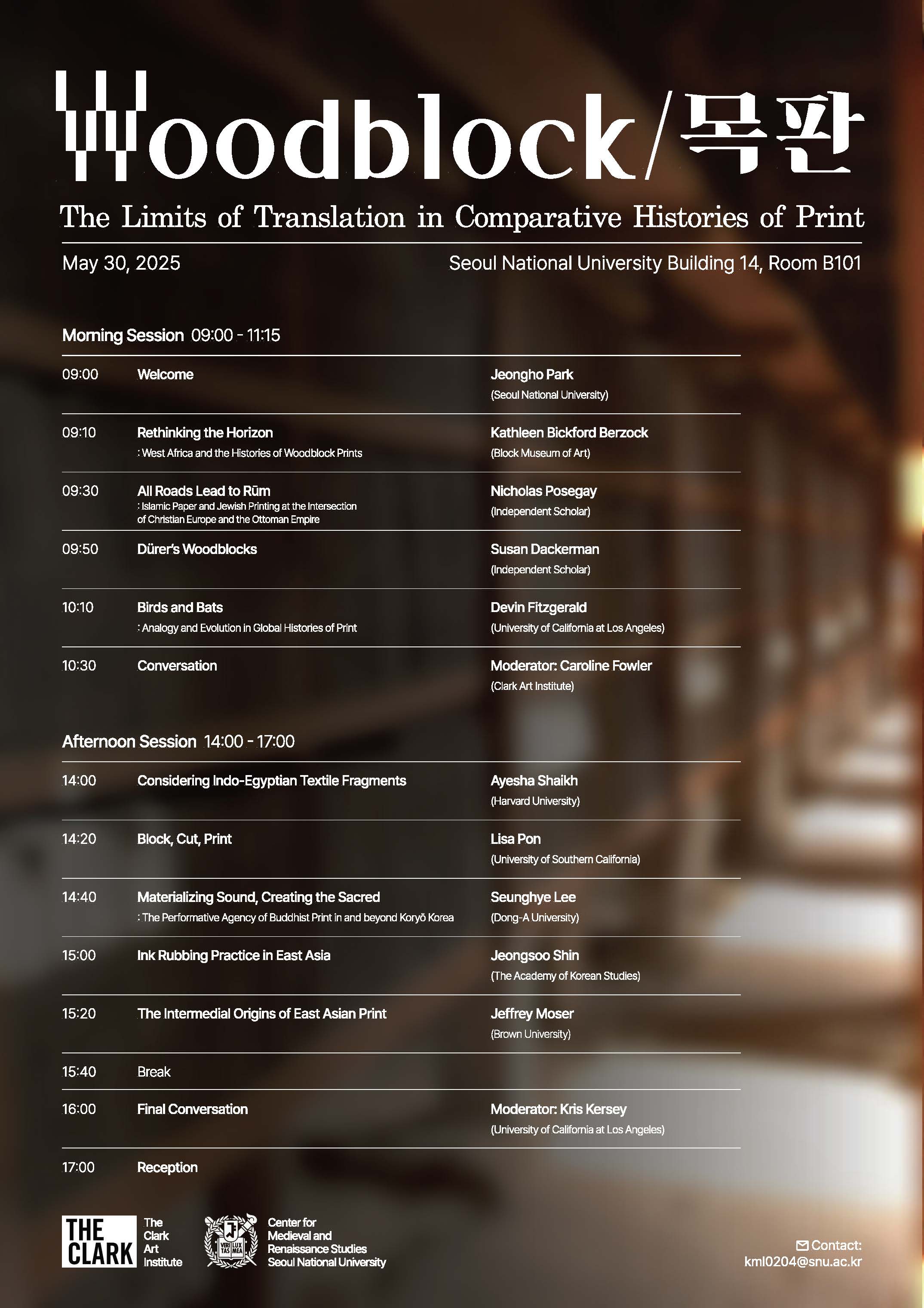 서울대학교 중세르네상스연구소에서는 미국 클라크미술사연구소(The Clark Art Institute)와 함께 아시아, 유럽, 아프리카의 목판 인쇄와 목판화의 역사에 대한 국제심포지엄을 개최합니다. 서지학, 미술사학, 문학, 역사학 분야에서 동서양의 목판 인쇄에 대한 연구를 해오신 전문가들의 발표가 계획되어 있으니 관심 있는 분들의 많은 참여를 부탁드립니다.