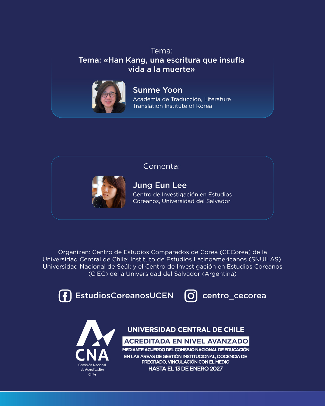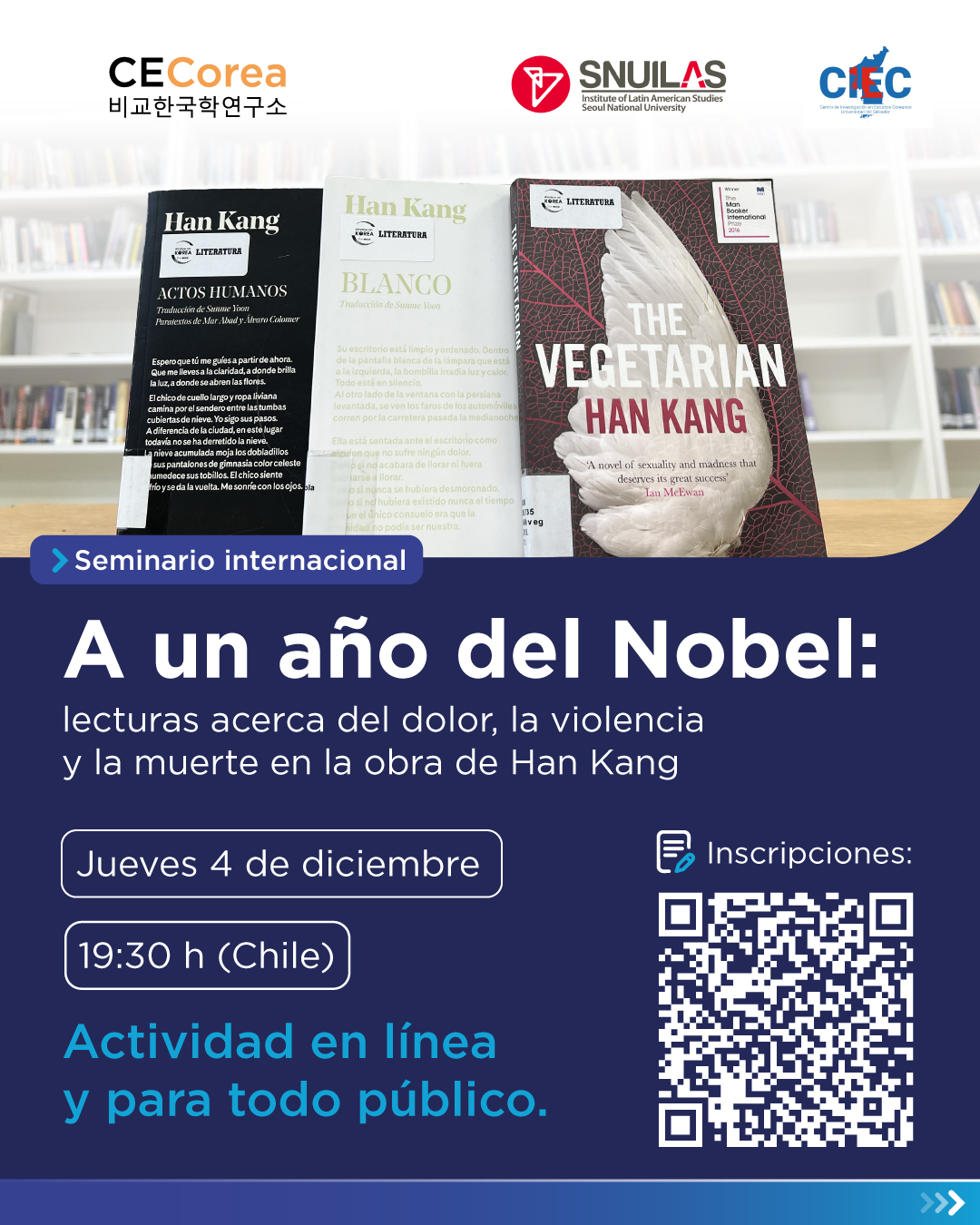 서울대학교 라틴아메리카연구소는 칠레센트랄대학교 비교한국학연구소와 아르헨티나 살바도르대학교 한국학연구센터와 함께 한강 노벨문학상 1년을 기념하는 온라인 학술행사를 개최합니다.