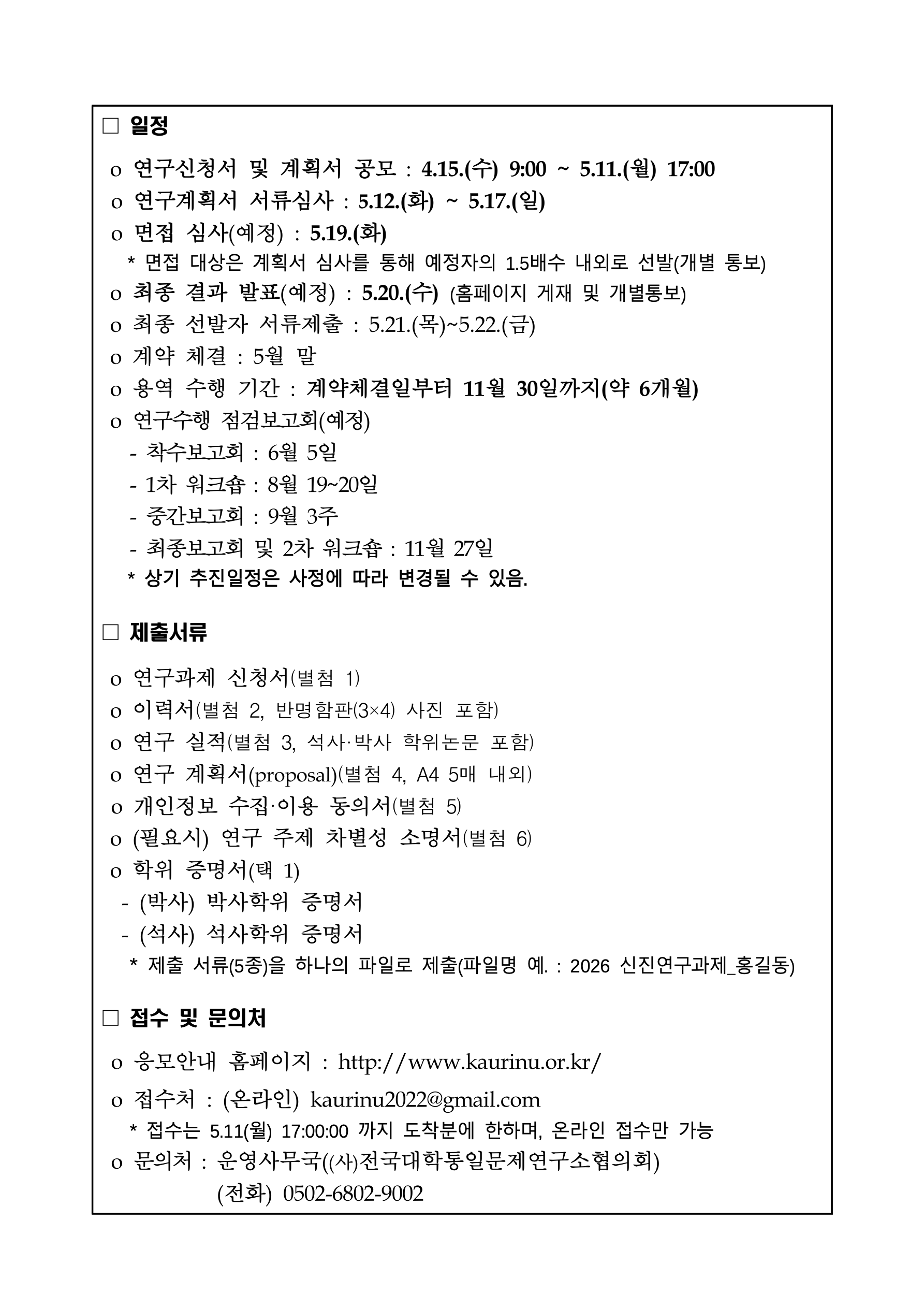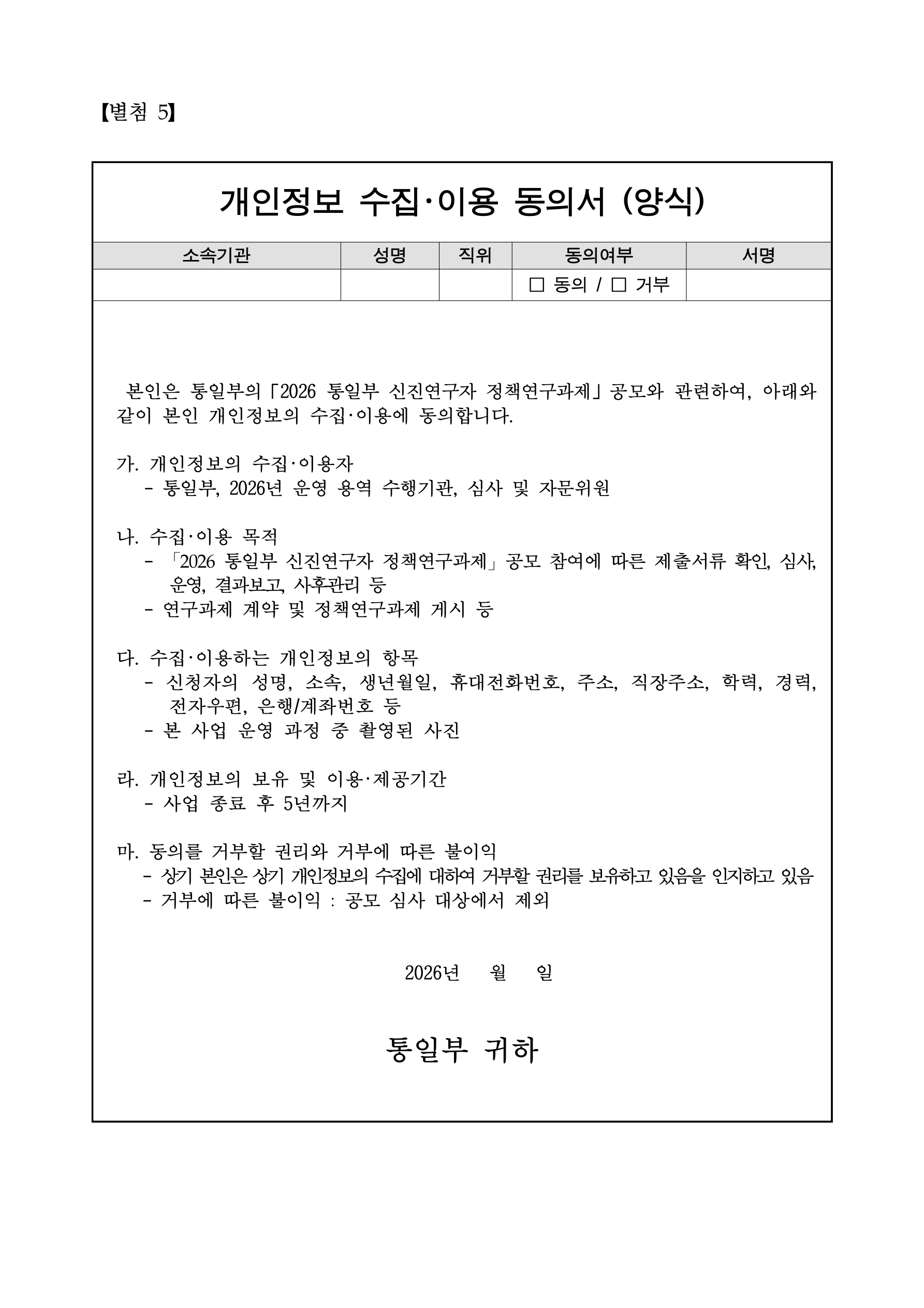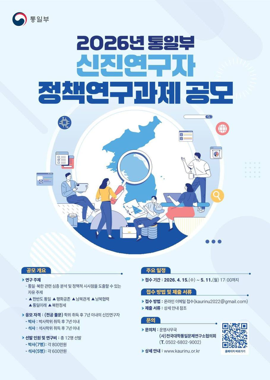 [통일부] 2026년도 신진연구자 정책연구과제 공모(-05/11)