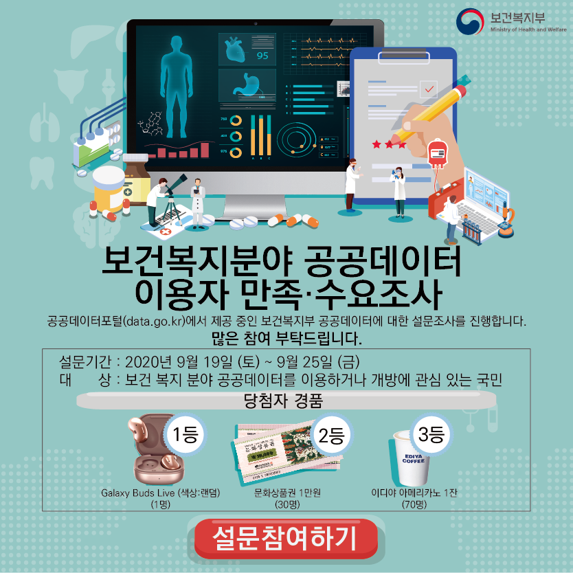 보건복지부에서는 수요자 중심의 데이터를 선제적으로 발굴하고 데이터가 일상생활과 산업에 활용되어 국민이 체감하고 만족하는 양질의 보건·복지 공공데이터 발굴 및 개방을 위해 이용자 및 잠재적 이용자를 대상으로 수요 및 만족도 조사를 실시합니다.