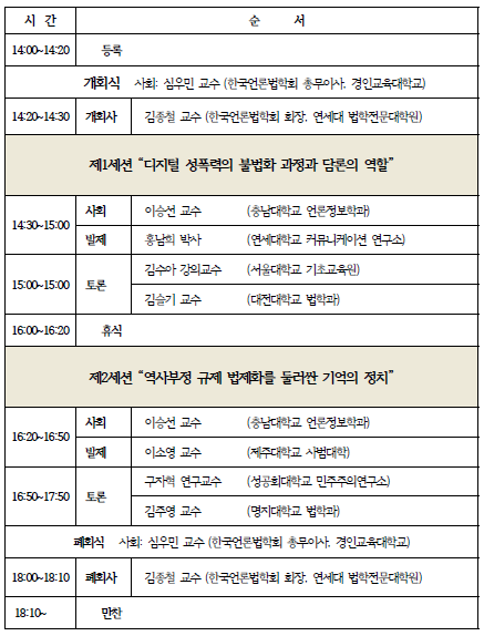 한편 사회갈등과 담론의 관계에 중요한 매개이자 대안의 장을 제공하는 것이 법의 역할이다. 합법/불법의 코드에 기초한 규제 및 불법화 방안이 담론 및 담론의 대상이자 공간으로서 사회 갈등에 미치는 영향에 대한 이해는 사회통합의 올바른 방향을 모색하는 중요한 의제일 수밖에 없다. 미디어 관련 법,정책 그리고 윤리가 우리 사회에서 차지하는 역할과 중요성을 깊이 인식하고 그에 관한 학문적인 연구 및 논의의 활성화를 도모하고자 설립된 한국언론법학회는 현재 우리사회에서 특히 부각되고 있는 사회 갈등과 이에 대한 담론의 긍정적, 부정적 현상을 분석하고 발전적 대안을 모색하는 학술세미나를 기획하였다. 다양한 사회갈등과 관련한 담론규제가 논의되고 있는 디지털 성폭력의 영역과 5.18역사부정의 소재를 소환하여 규제담론의 의의, 역할, 한계를 종합적으로 고찰하고자 한다.