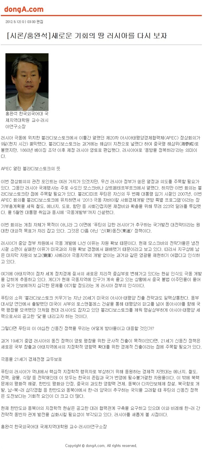 [언론보도][시론/홍완석]새로운 기회의 땅 러시아를 다시 보자 - 동아일보 (2012.09.12)
