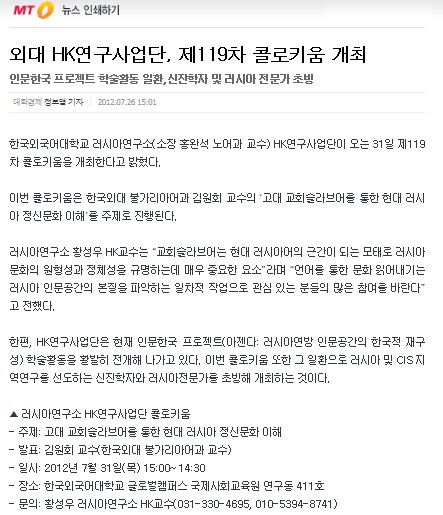 [언론보도]외대 HK연구사업단, 제119차 콜로키움 개최-머니투데이(2012.07.26)