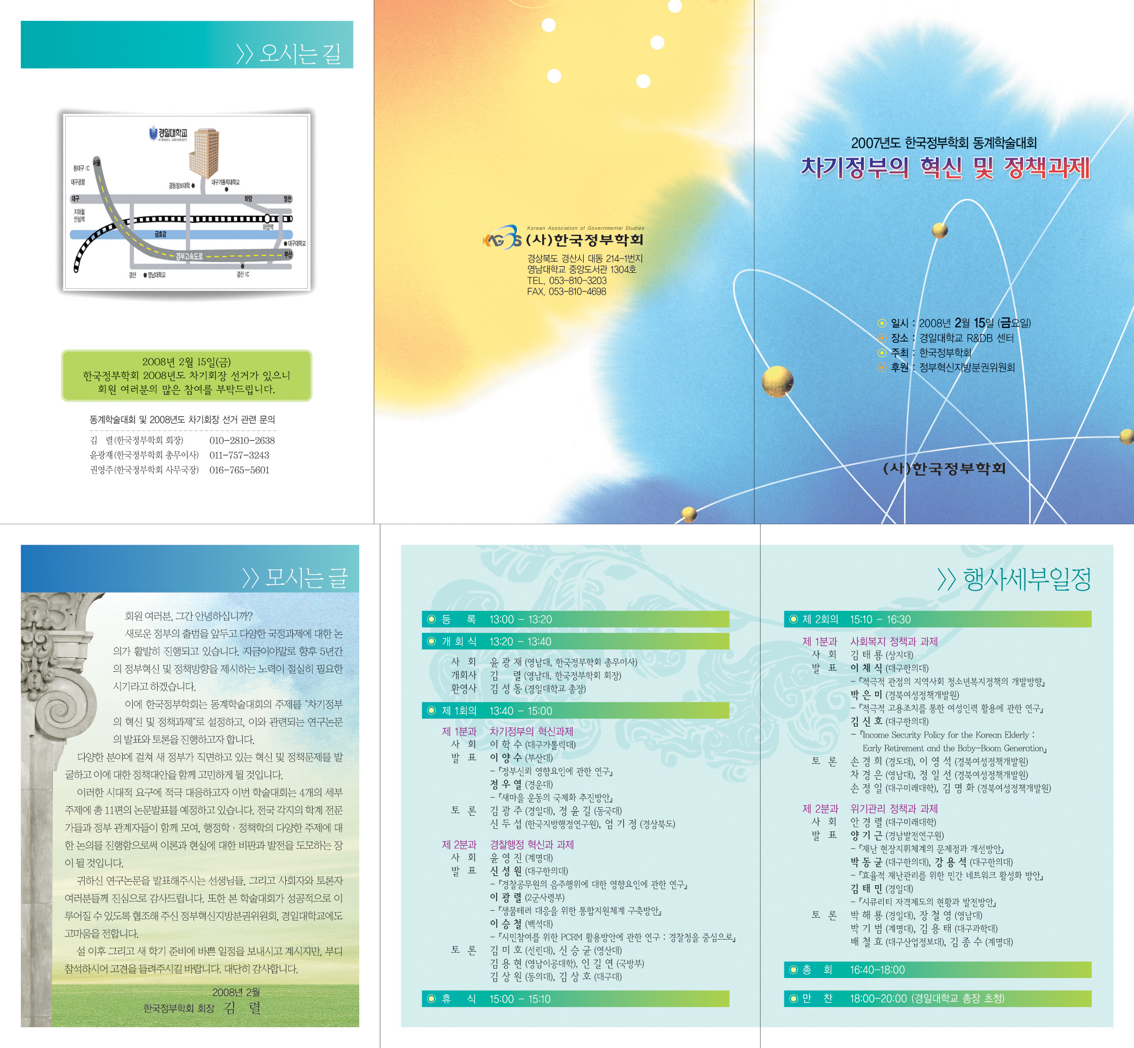 한국정부학회는 2008년 2월 15일(금)에 2008년도 차기회장(2009년 회장) 선거 및 2007년 동계학술대회를 아래와 같이 개최합니다.