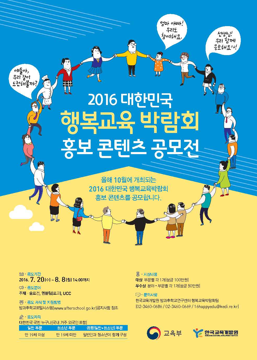 안녕하세요. 총무보조간사 장아름입니다. 교육부가 주관하고 한국교육개발원과 울산광역시교육청, KBS가 주최하는 2016 대한민국 행복교육박람회가 다가오는 10월에 개최됩니다. 2016 대한민국 행복교육박람회는 자유학기제 등 6대 교육개혁과제의 성과를 모든 국민에게 홍보하여 '꿈·끼·행복교육 실현'의 희망 메시지를 공유하는 '교육 축제'의 장으로 꾸며질 예정입니다. 따라서 국민 모두가 박람회 행사 구성 과정에서부터 참여하여 국민과 함께 박람회를 운영하고자 '2016 대한민국 행복교육박람회 홍보 콘텐츠 공모전'을 실시하오니, 관심 있으신 회원 분들의 많은 참여 바랍니다. 감사합니다.
