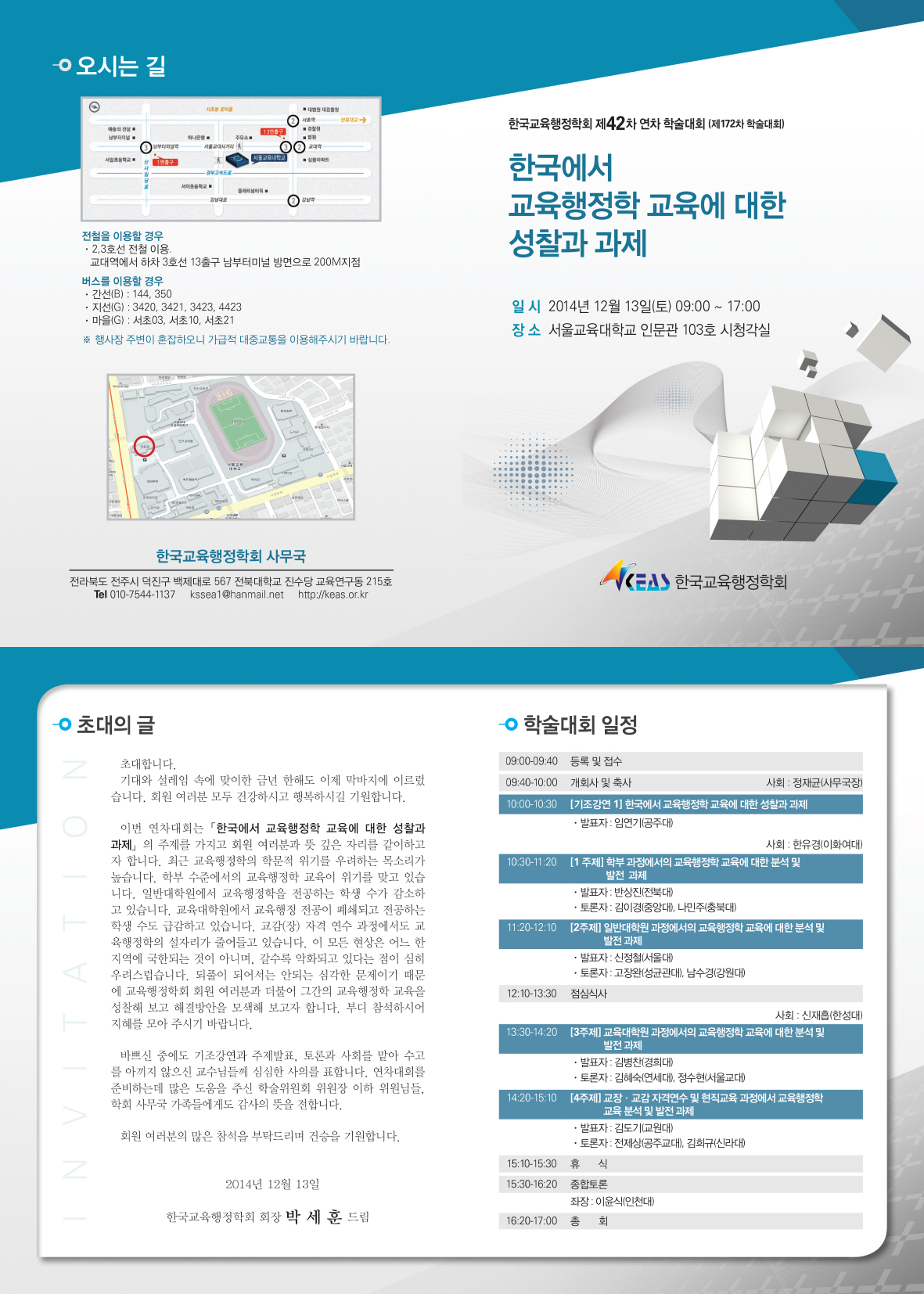 안녕하세요 한국교육행정학회 사무국입니다. 한국교육행정학회 제42차 연차학술대회가 12월 13일(토) 서울교육대학교에서 개최됩니다. 회원여러분의 많은 관심과 참여바랍니다. 자세한 내용은 첨부파일(초대장)을 참고하시기 바랍니다. 사무국올림.