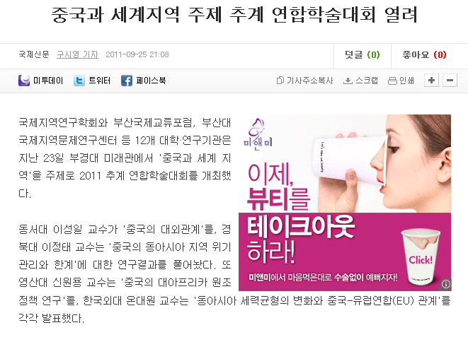 국제지역연구학회와 부산국제교류포럼, 부산대 국제지역문제연구센터 등 12개 대학·연구기관은 지난 23일 부경대 미래관에서 '중국과 세계 지역'을 주제로 2011 추계 연합학술대회를 개최했다.