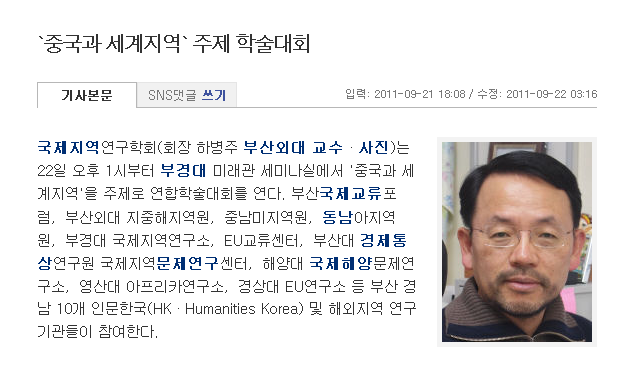 국제지역연구학회(회장 하병주 부산외대 교수 · 사진)는 22일 오후 1시부터 부경대 미래관 세미나실에서 '중국과 세계지역'을 주제로 연합학술대회를 연다. 부산국제교류포럼,부산외대 지중해지역원,중남미지역원,동남아지역원,부경대 국제지역연구소,EU교류센터,부산대 경제통상연구원 국제지역문제연구센터,해양대 국제해양문제연구소,영산대 아프리카연구소,경상대 EU연구소 등 부산 경남 10개 인문한국(HK · Humanities Korea) 및 해외지역 연구기관들이 참여한다.