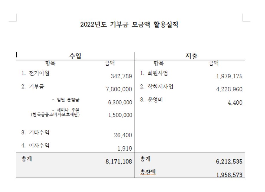 사단법인 한국FP학회 2022년 연간 기부모금액 및 활용실적을 공시합니다.