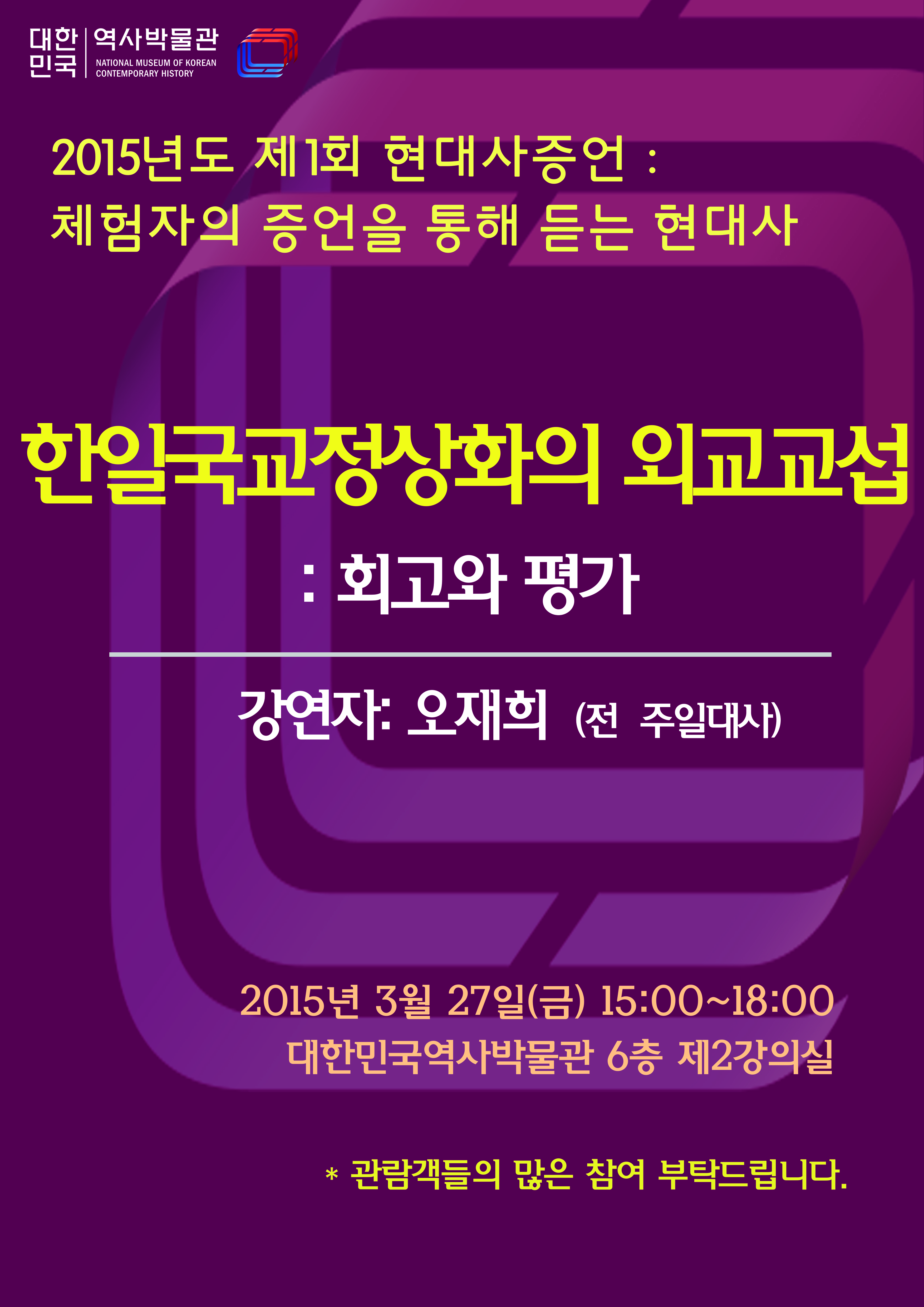 먼저 3월에 개최하는 1차 현대사 증언은 한일국교정상화의 외교교섭에 실제 참여했던 오재희 전주일대사를 모시고 외교교섭 과정과 한일국교정상화의 과정을 역사적으로 재조명해보고자 합니다. 관심 있는 분의 많은 참여를 바랍니다.