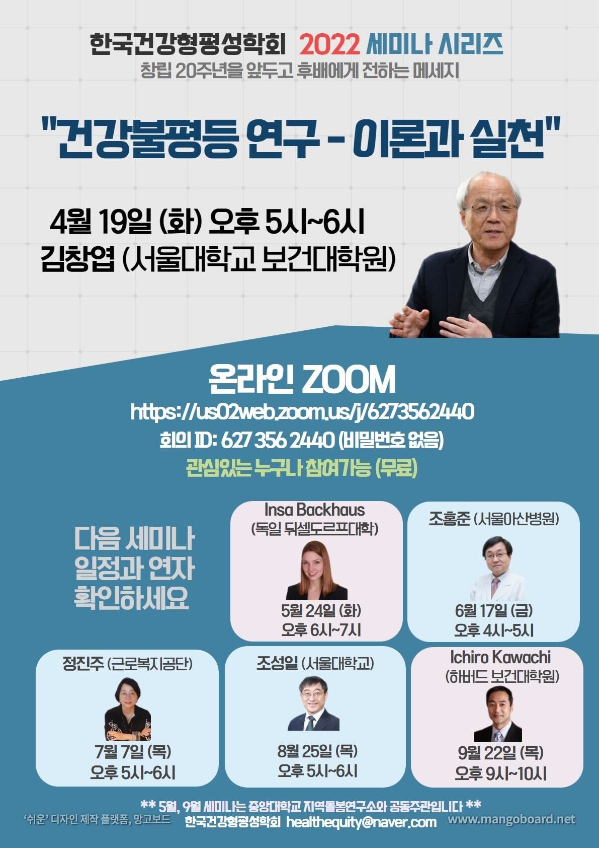 한국건강형평성학회에서는 창립 20주년을 앞두고 '후배에게 전하는 메세지'를 주제로 세미나 시리즈를 진행합니다.