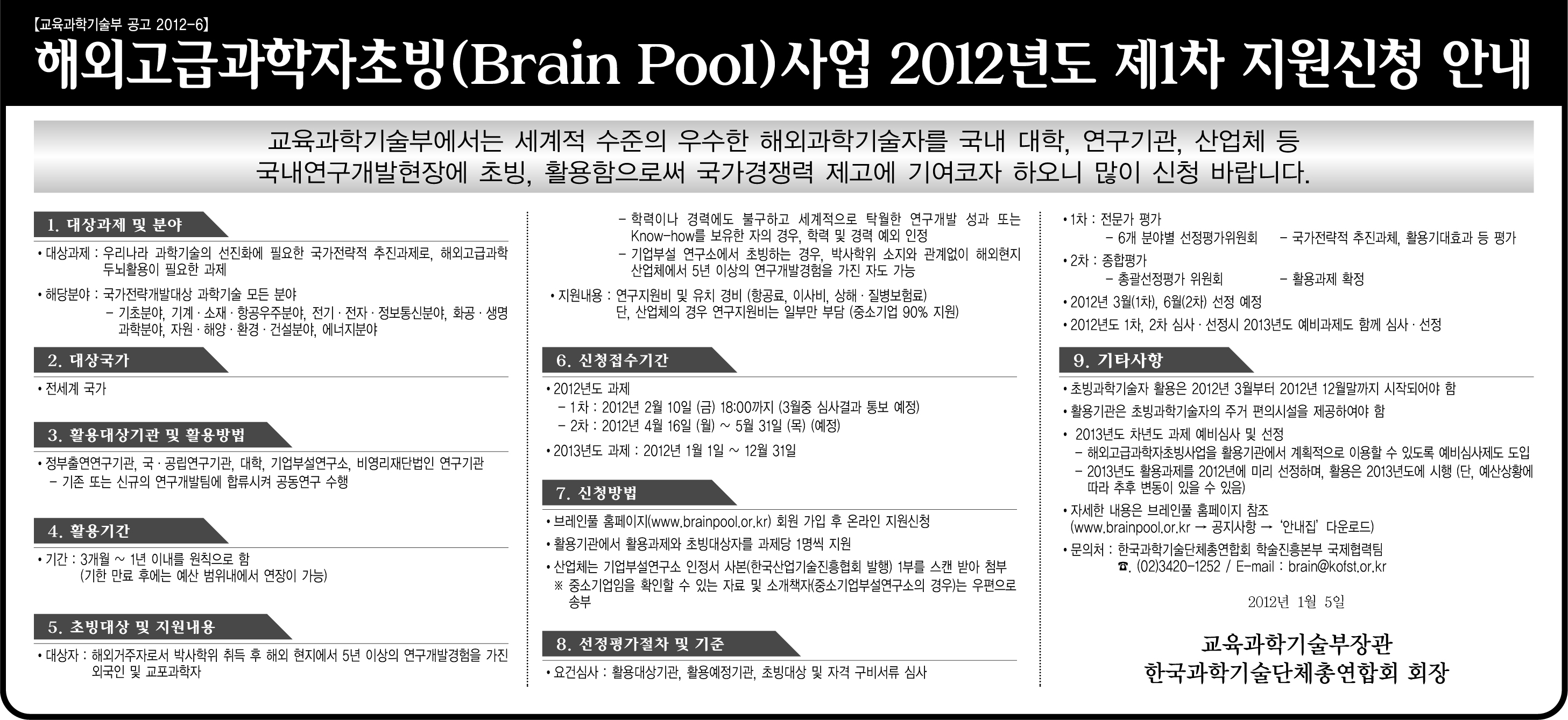 한국과학기술단체총연합회에서는 해외고급과학기술자를 국내 대학, 연구기관, 산업체 등 국내연구개발현장에 초빙,활용하는 '해외고급과학자초빙사업'의 2012년도 제1차 지원신청을 2월 10일까지 접수 합니다.